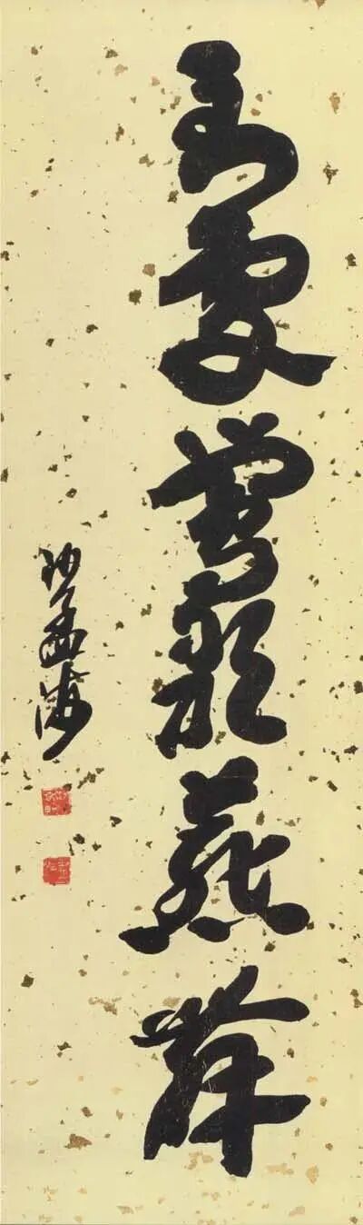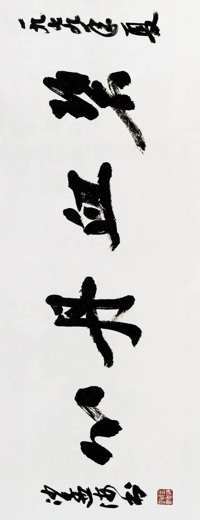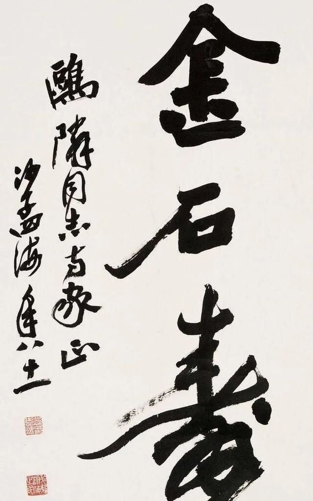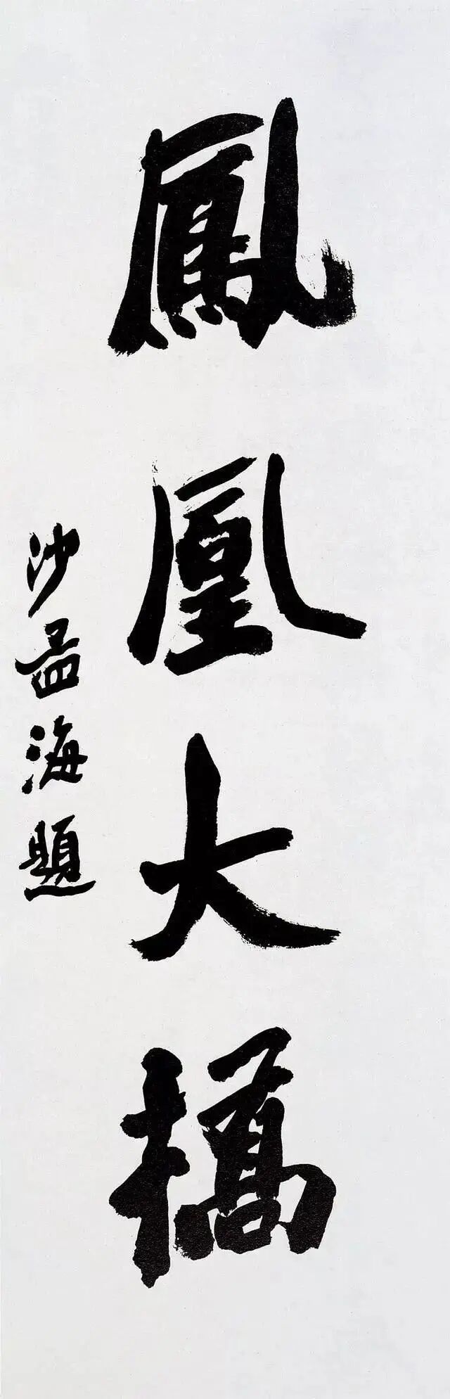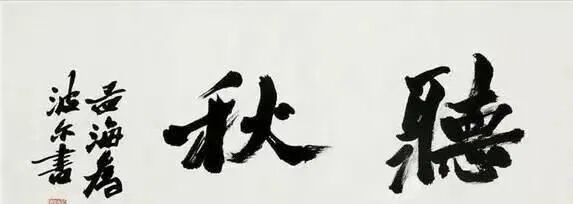 沙孟海最为后世所知与认可的,当数他的榜书。榜书,古称署书,即题在宫阙门额上的大字。其大字用笔横扫,出入自如,结体险劲逼仄,构成上点、线、块、面对比强烈,空间感、现代感极强。用墨更趋浓重,苍老、生辣、遒劲,气酣势疾,刚健有力,韵味沉厚,卓然成家,“真力弥满,吐气如虹。海内榜书,沙翁第一”。