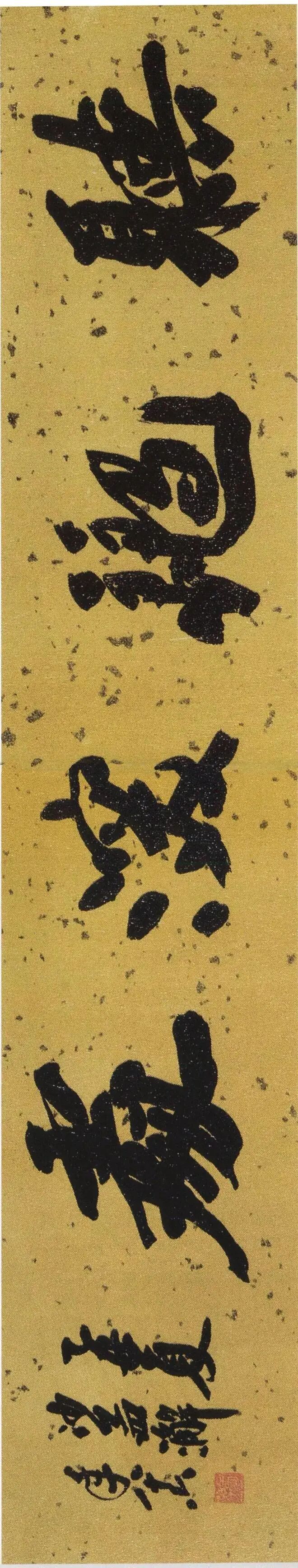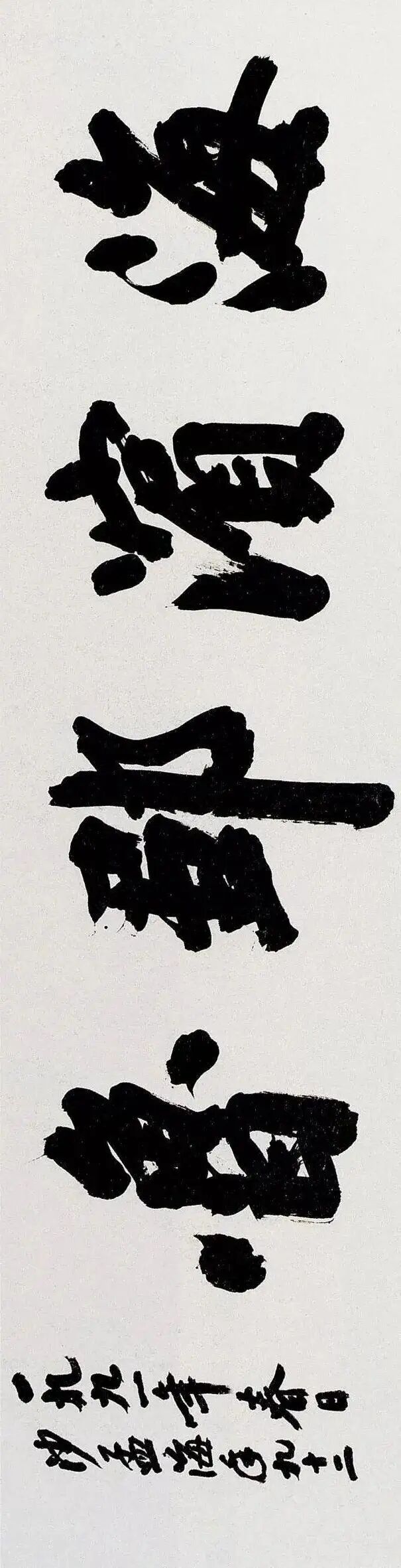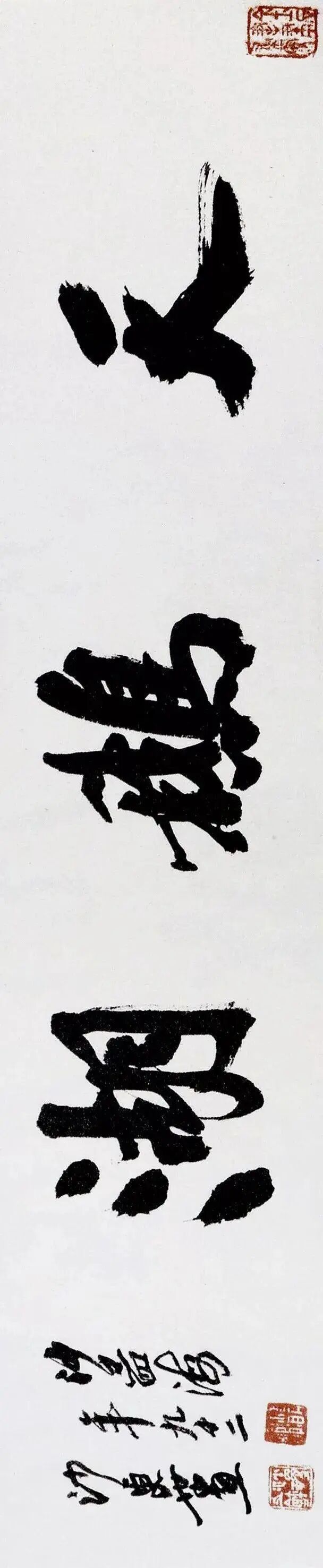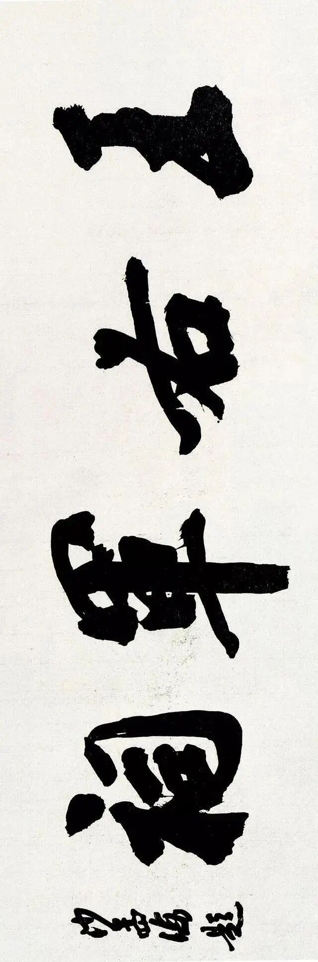 沙孟海最为后世所知与认可的,当数他的榜书。榜书,古称署书,即题在宫阙门额上的大字。其大字用笔横扫,出入自如,结体险劲逼仄,构成上点、线、块、面对比强烈,空间感、现代感极强。用墨更趋浓重,苍老、生辣、遒劲,气酣势疾,刚健有力,韵味沉厚,卓然成家,“真力弥满,吐气如虹。海内榜书,沙翁第一”。