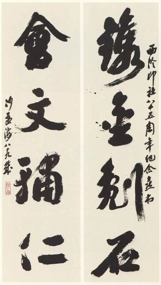 沙孟海《西泠印社八十五周年镌金会文四言联》93×24cm×2 1988年