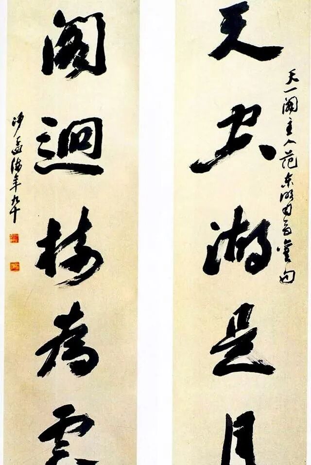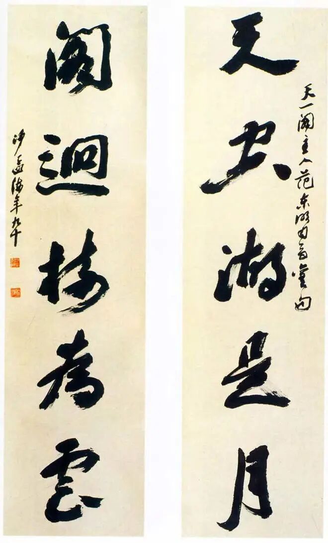 释文:天空湖是月,阁回树为雲。——天一阁主人范东明司马旧句。沙孟海年九十。