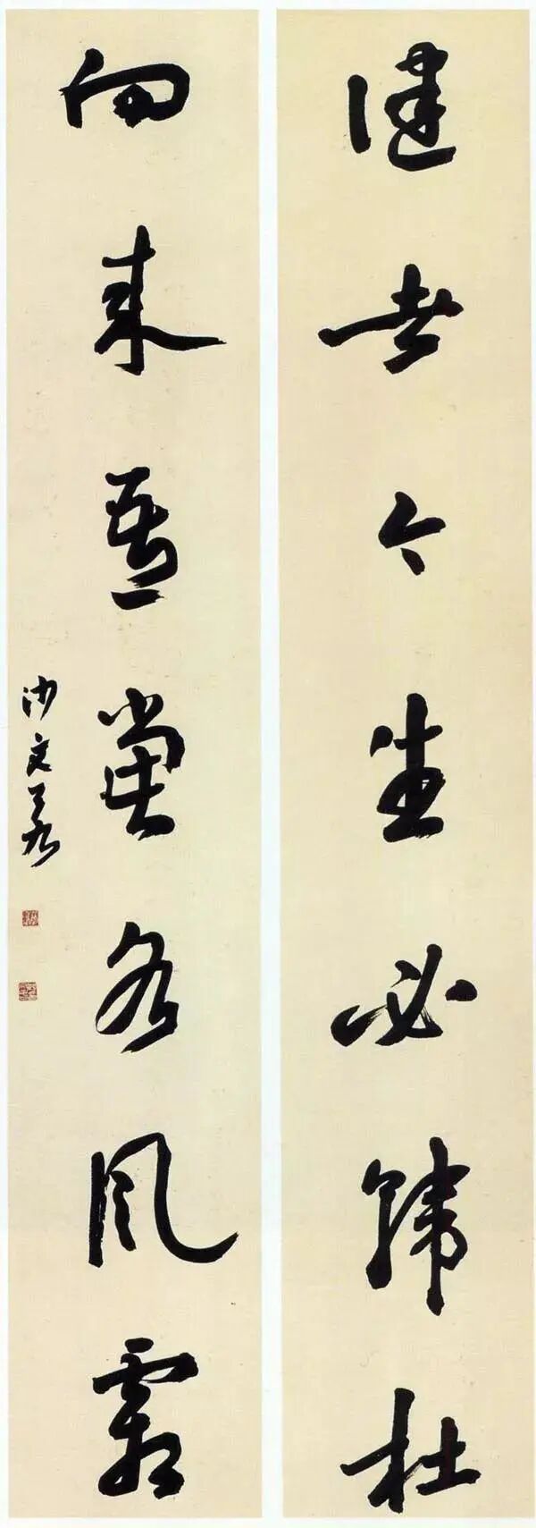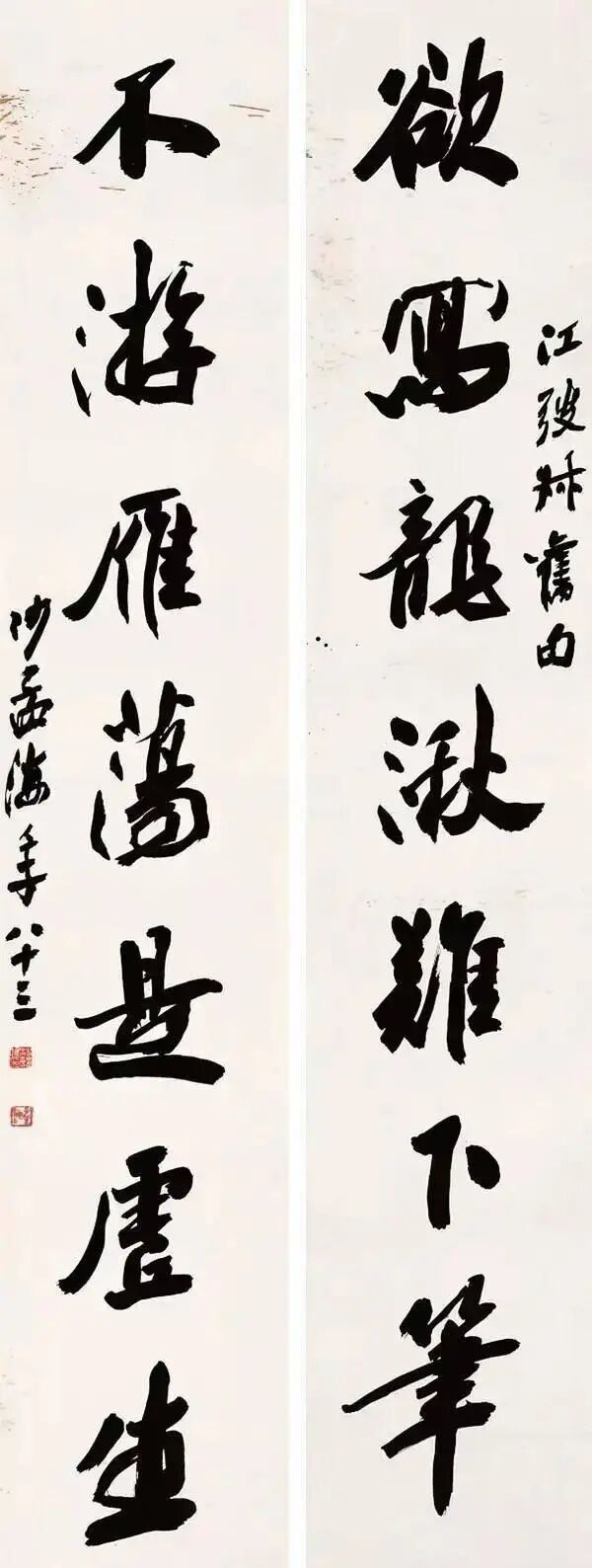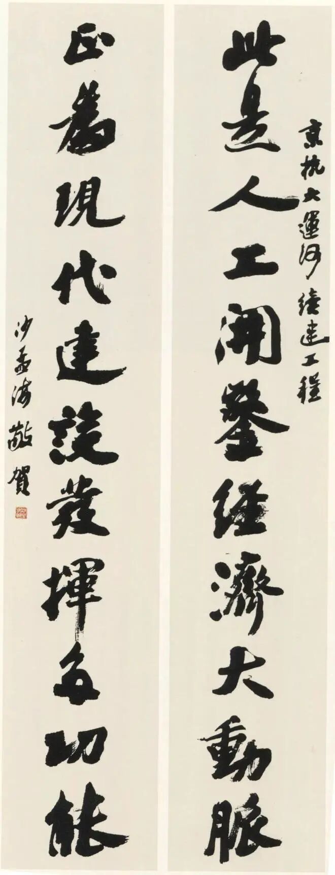 沙孟海《京杭运河续建工程十一言联》 180×32cm×2 1987年