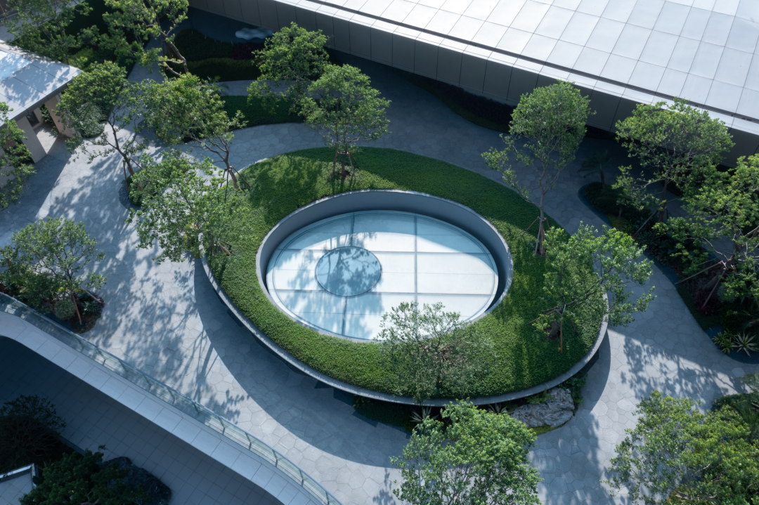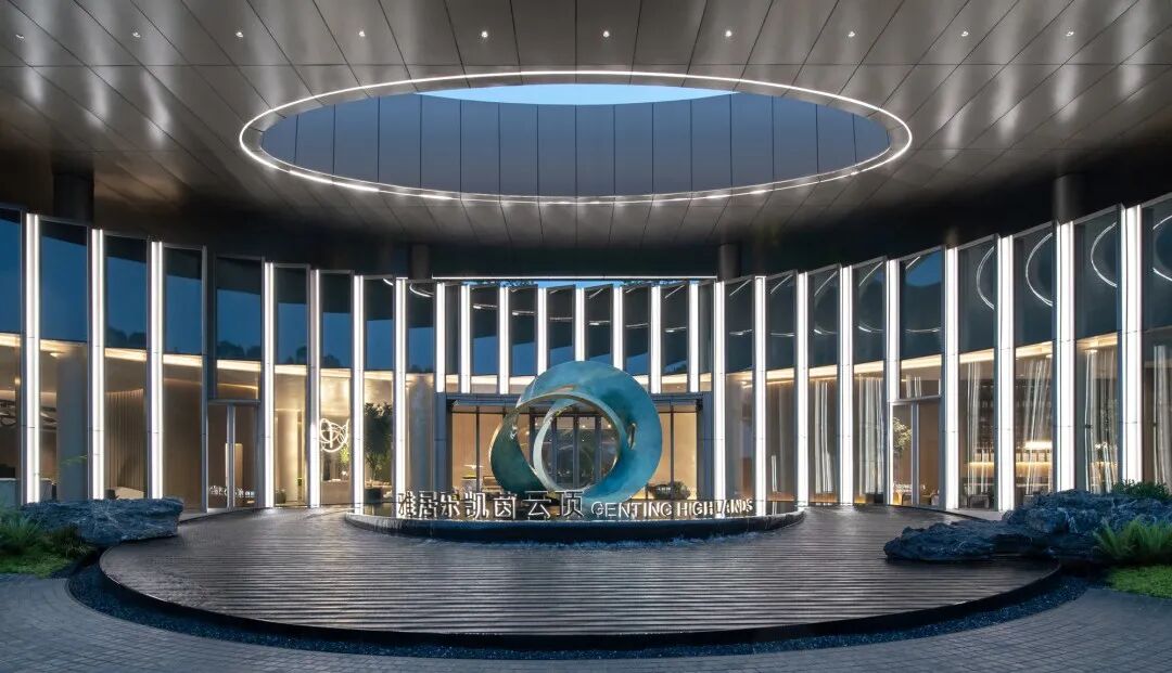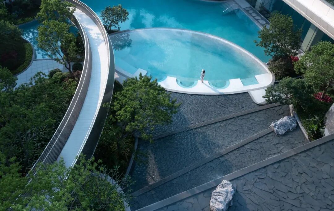在步入山水会馆的那一刻,外部的嘈杂与忙碌都悄然停止,宛如时间本身也停止在了一种平静而流畅的空间里。被林荫包围的超大尺度入口空间,与建筑圆洞紧密的云聚水境,不知不觉给人带来一种充满酒店感的高级度假氛围。