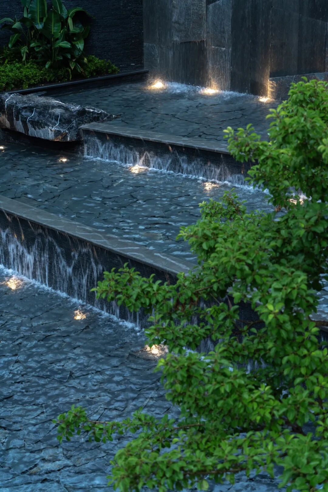 Mirror water: The water feature isdecorated by the rusty bronze surface, copper foil edge and slate hand tohighlight the unique style of the space.