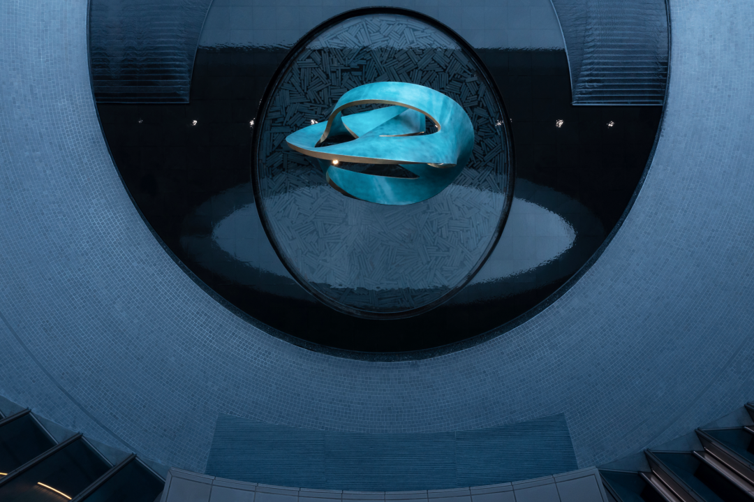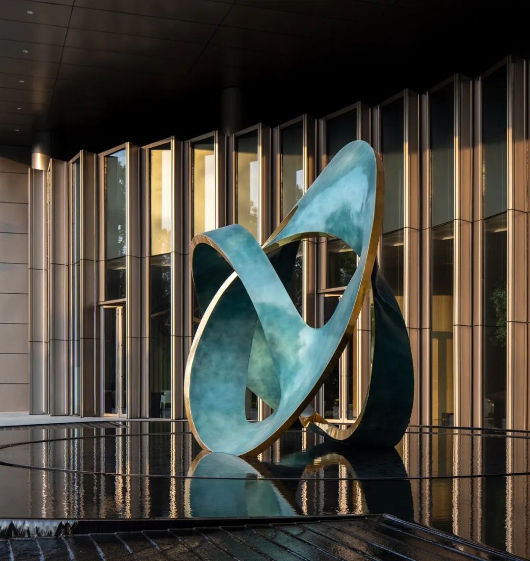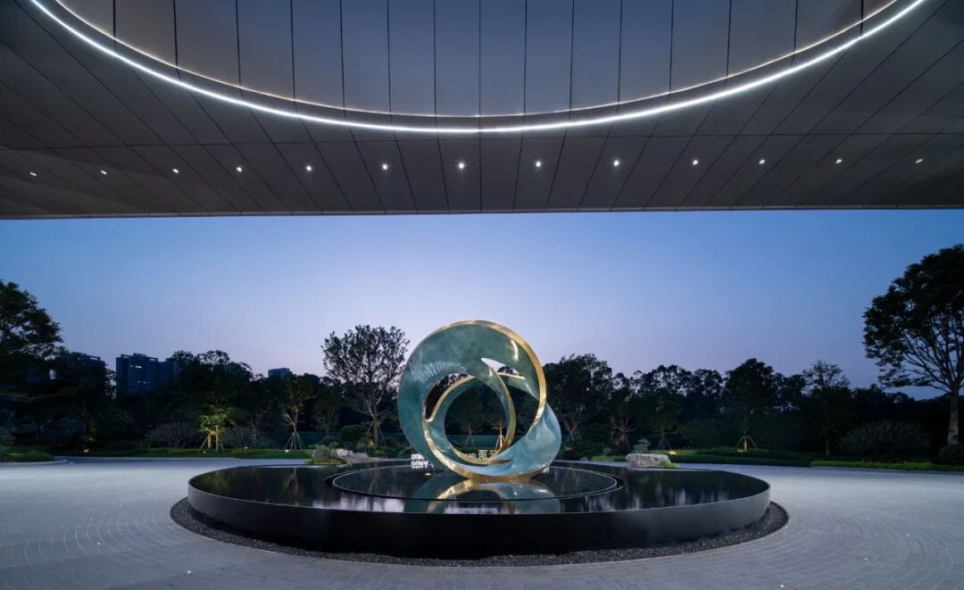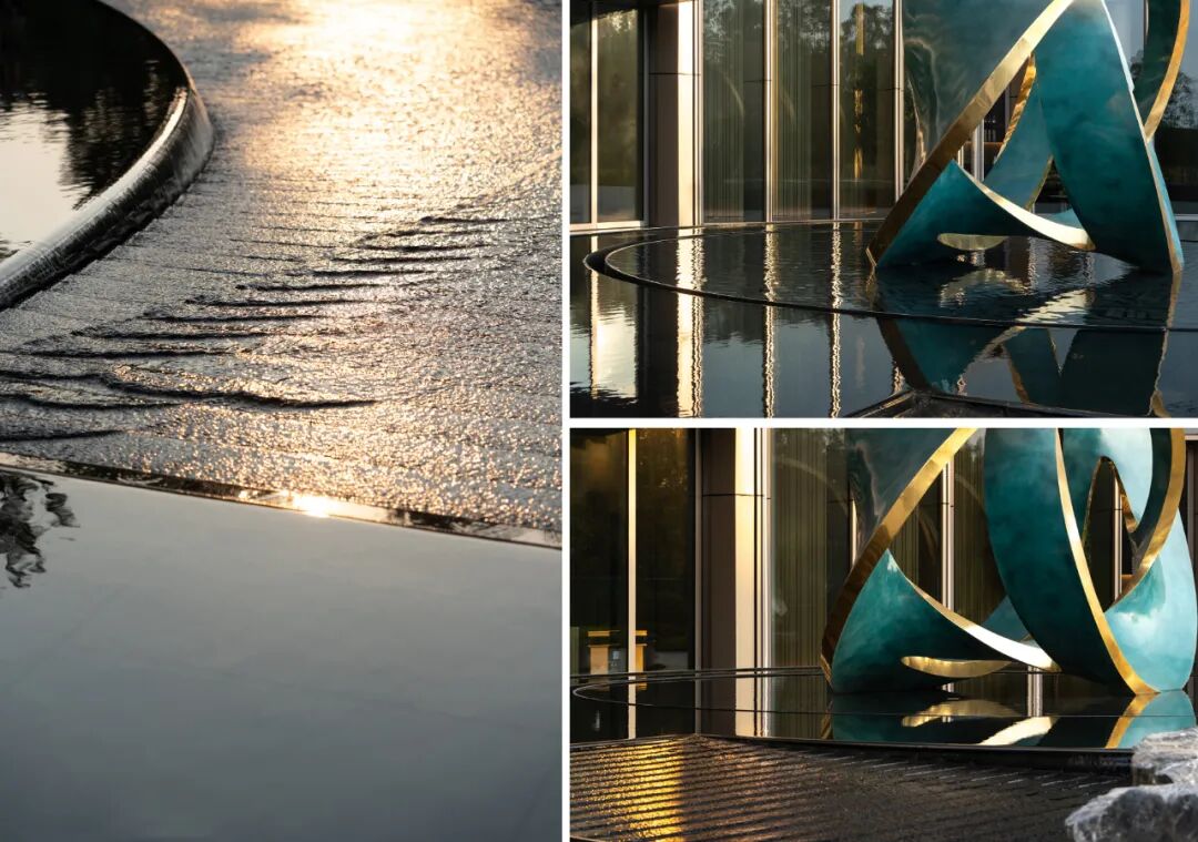 云聚水境:极具山水人文特征的装饰性水景艺术;青铜锈蚀表面,紫铜金箔封边的云聚雕塑隐映在长条板岩手摆的池底,层现出独属这里的归家高级感。