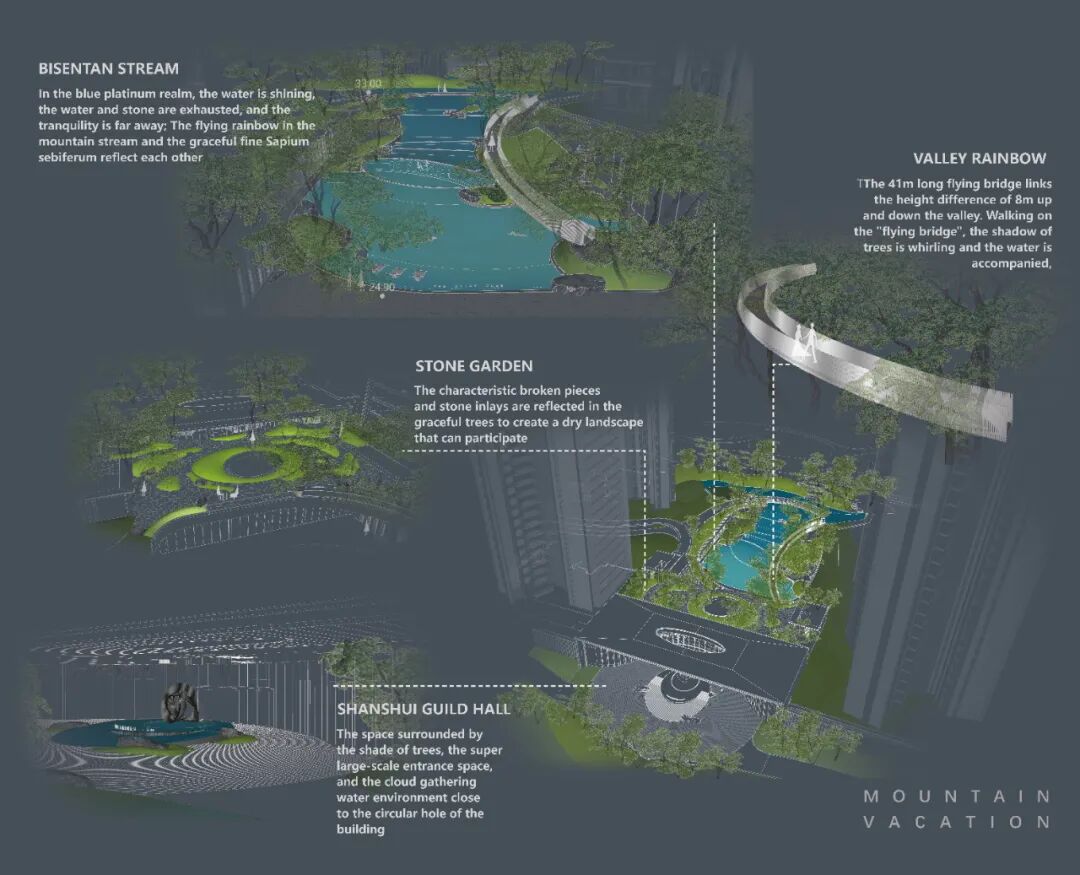 为此,以“山水会馆”开篇,经“碧森潭涧”、“山谷飞虹”、高山流水、“石上花园”,为意境的山地度假次第展开。