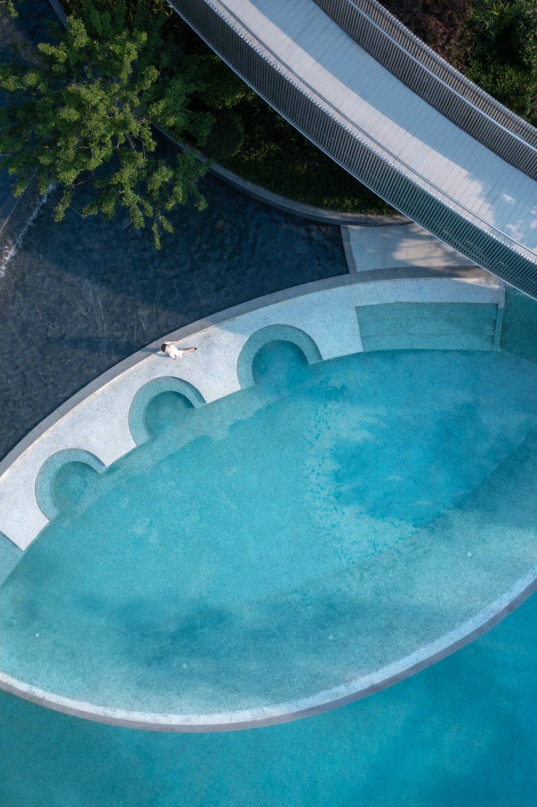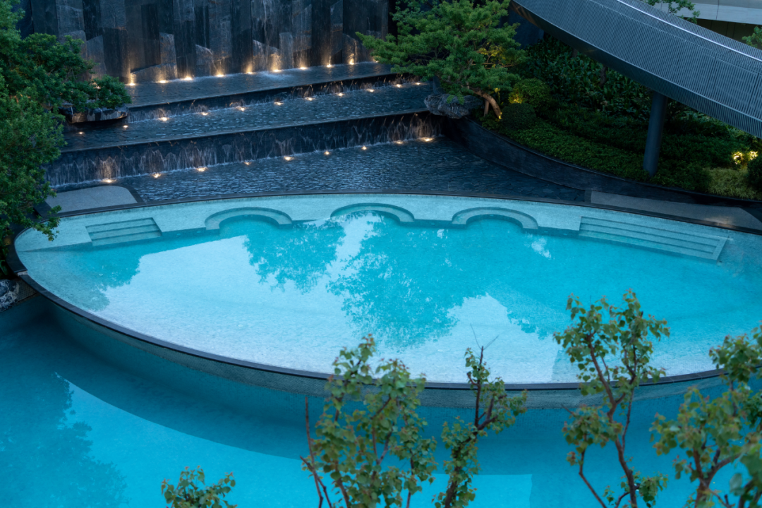 在泳池材料的选择和规格大小上,经过多轮现场打样确定为更现代,更有设计感的48*48海浪灰花岗石,呈现属于当下审美的山地泳池景观。