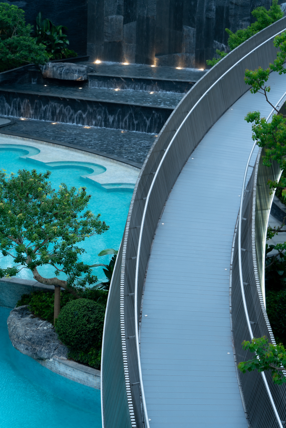 错落的台阶,层层的叠水,水石相罄,宁静致远;山涧里的飞虹与造型婀娜的精品乌桕相互隐映;在这天然的山谷中的山、林、水、石,旨在演绎这顶级的山地度假之境。