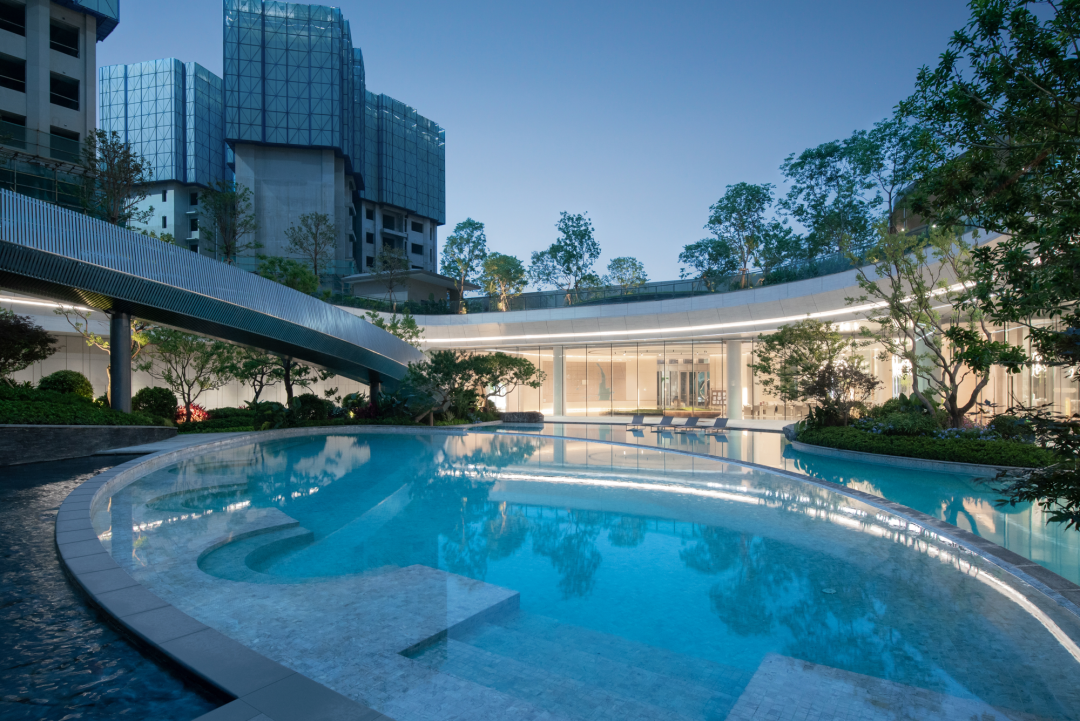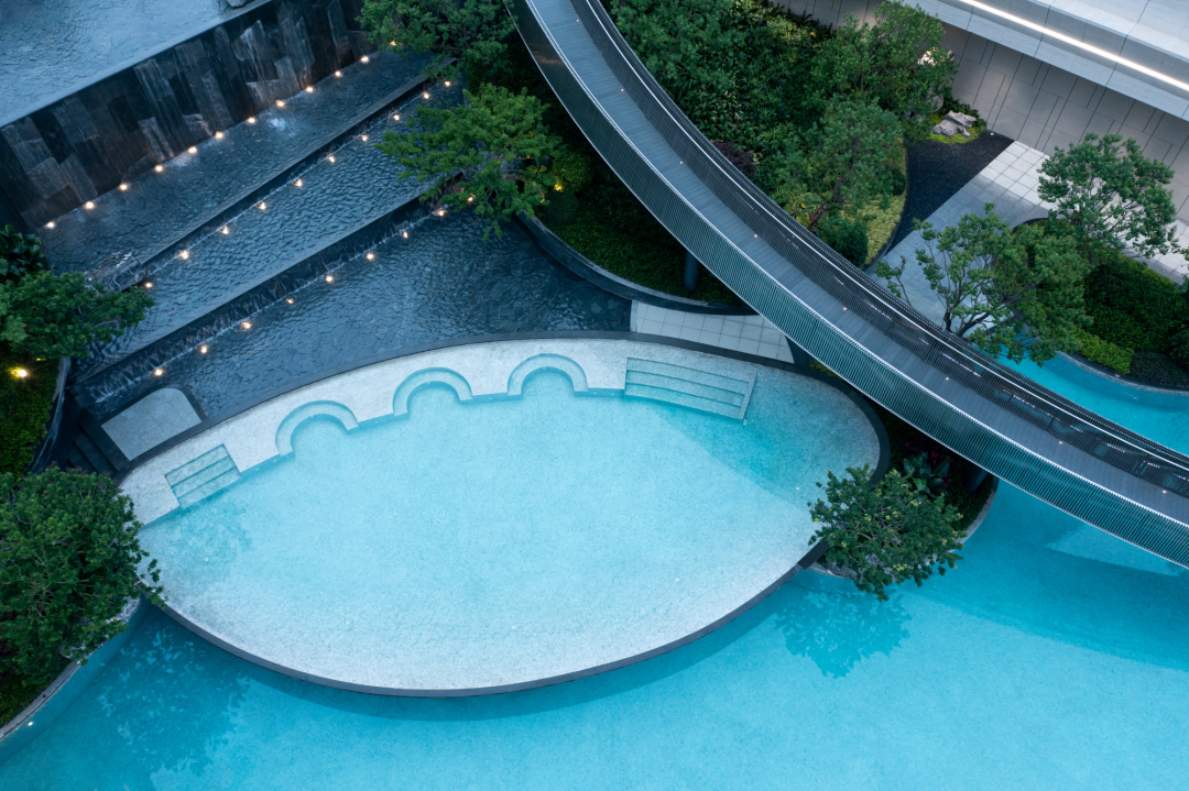 未见其实,先闻其声,在营销中心中便能听到后场潺潺流水,循声而至,映入眼帘的便是一副山水度假生活画卷,一方蓝铂之境,水光潋滟,是全龄室外的戏水泳池;