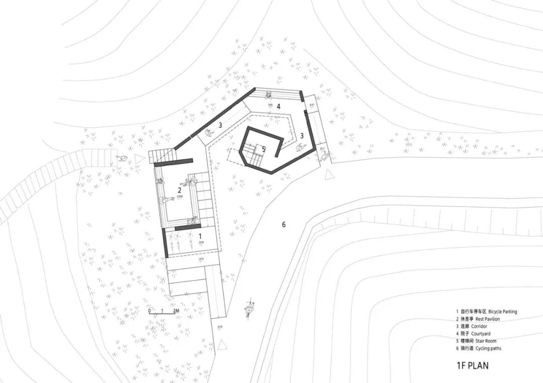 建筑在群山之中,位于一段自行车骑行道的最高点,是一处骑行者休息的驿站。此处向北视野开阔,但在人的高度视线受到植被干扰,所以跳房子工作室设计一个可以登高远望的驿站。
