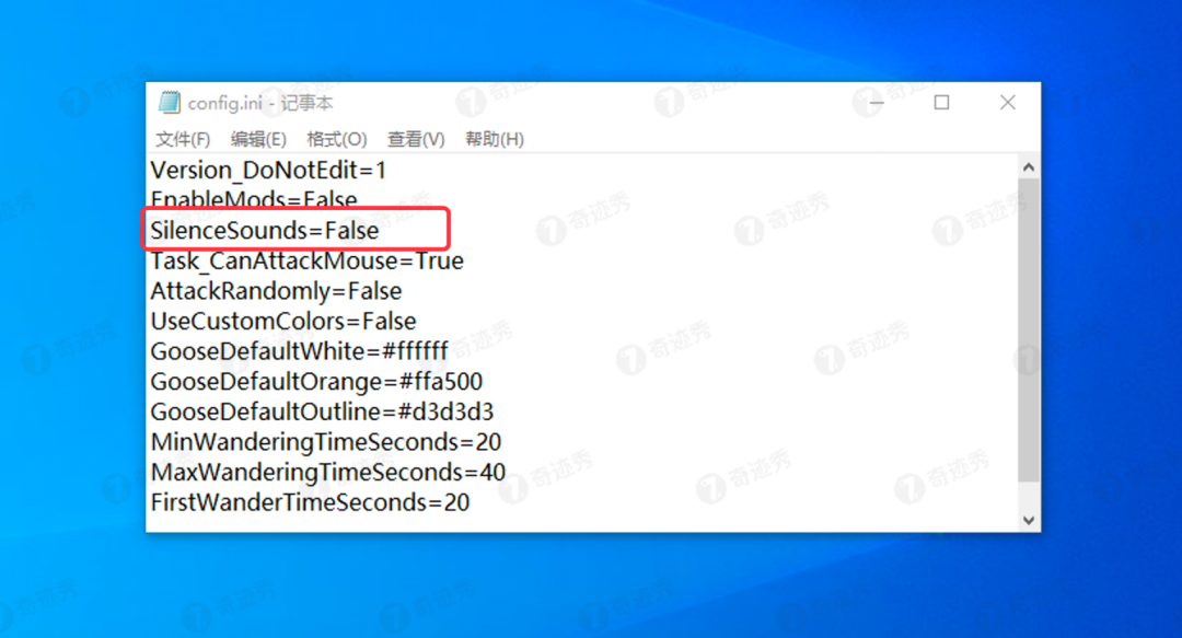 关闭声音:找到config.ini,这个文件就是修改配置的,用txt打开它,里面有一个SilenceSounds=false,把后面的false改成true就可以变成无声了。