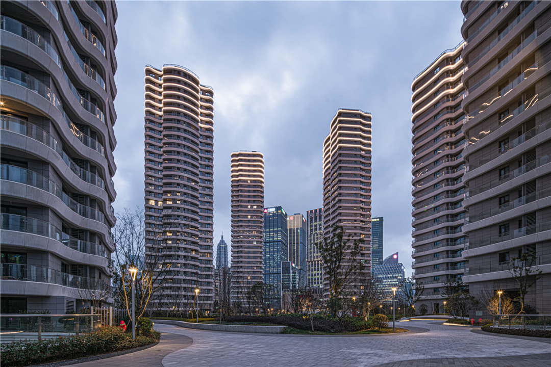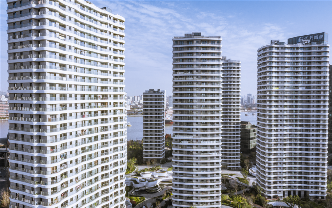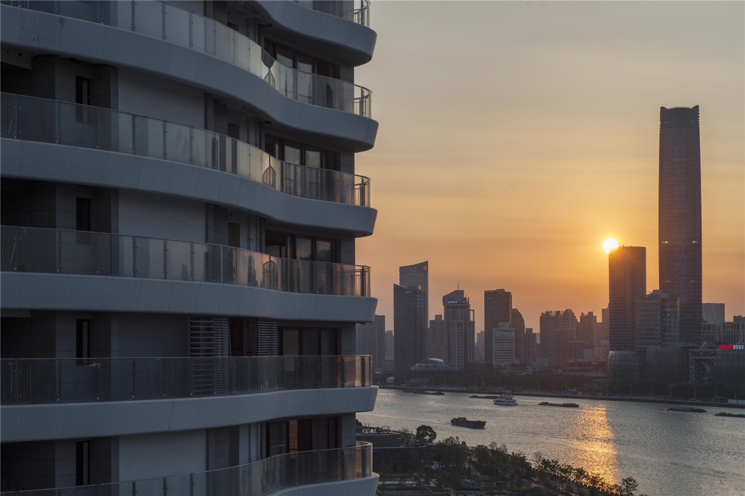 “九庐要把江景和城市的景观用到最足,所以我们从第一天规划起,就采用了另一种方式——不是把住宅切成平行的板块,而是沿着基地的外围,沿着最大的边长去利用最大的景观面,内部也形成了自然的公园。”