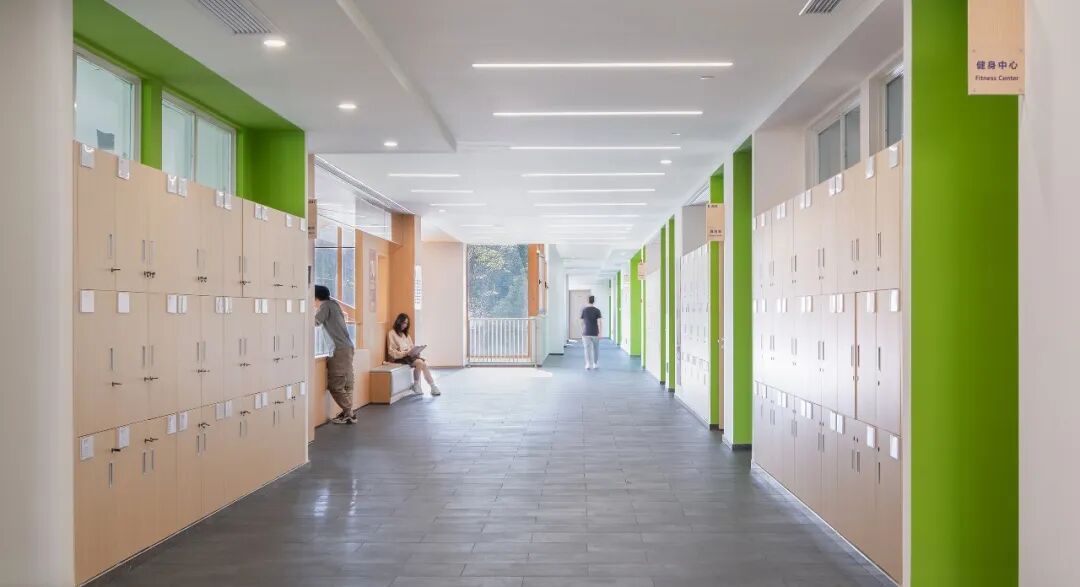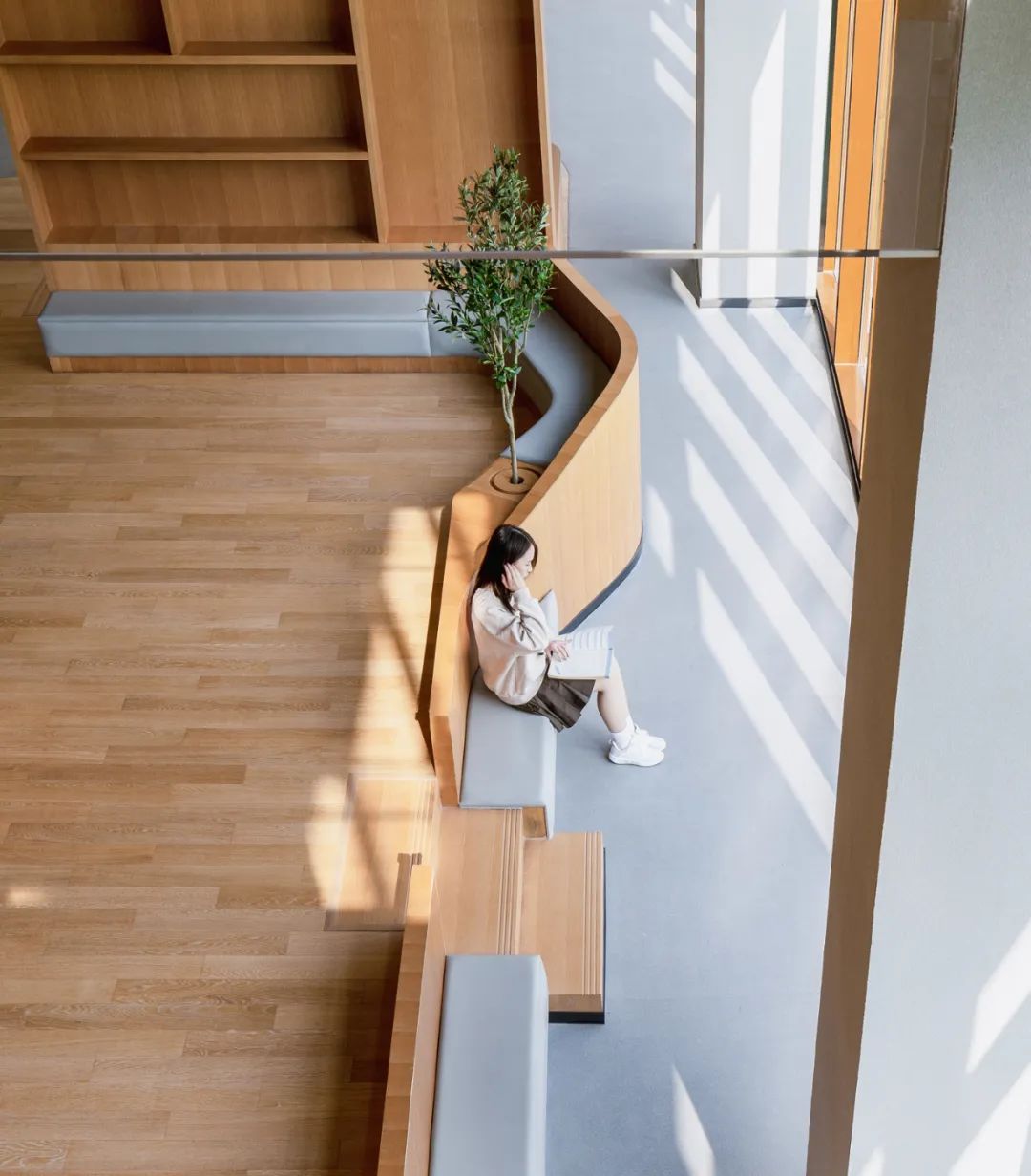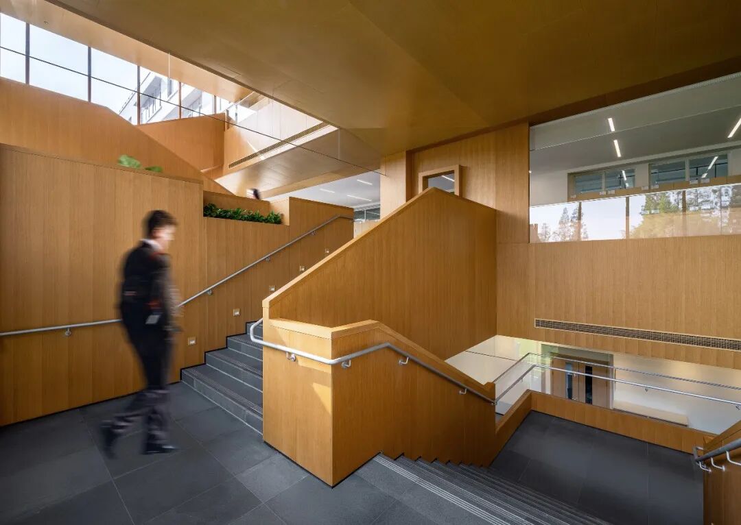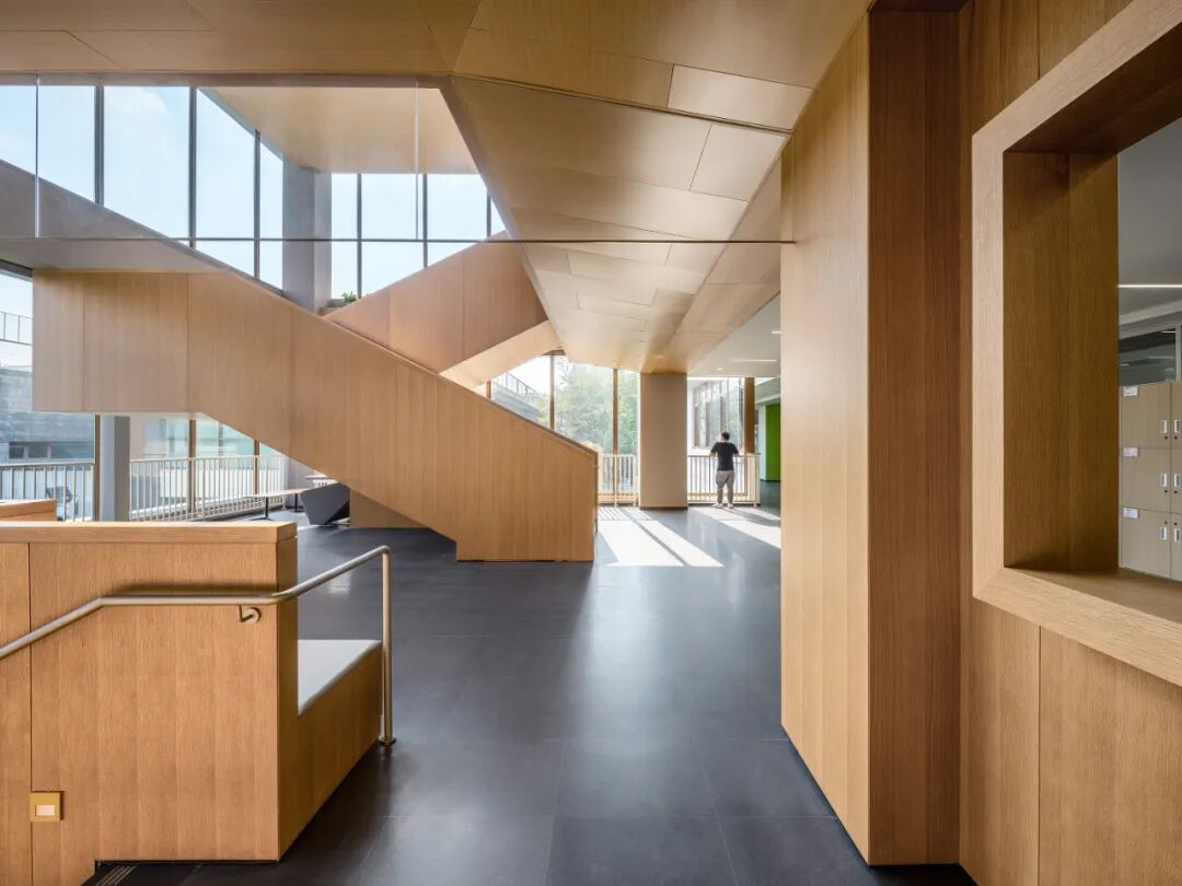 学校课程体系灵活多样,上课采用走班制方式,学生在不同科目课室之间穿梭,中庭内宽敞的楼梯满足了课间频繁的上下走动需求。设计将平台、栏板、座凳、种植箱等元素整合在统一的、温暖可感的语言中,来营造偶遇和交流的场景。在没有固定班级教室情形下,不同的共享空间也成为学生个人自习、小组研讨的弹性学习场所,是一种无边界的开放课堂。