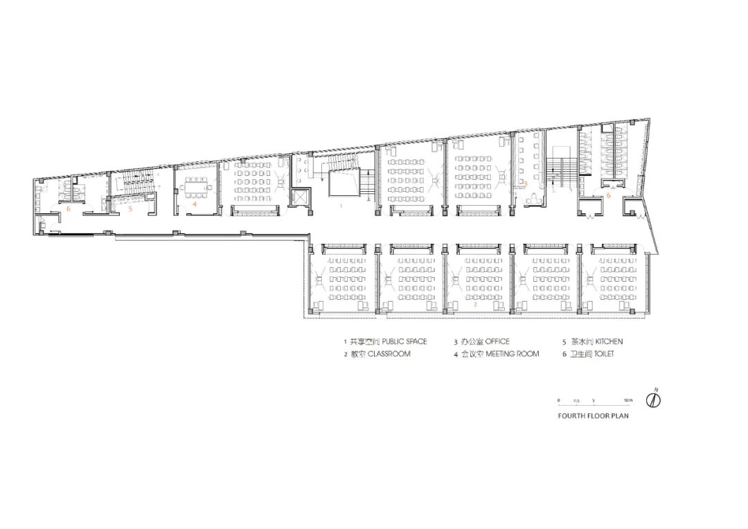 蜿蜒的楼梯持续地变换方向,让身处其中的人们建立起建筑内外环境之间的关联。中庭到达三层后,偏移至北侧继续往上,形成一组尺度更亲密的共享空间。