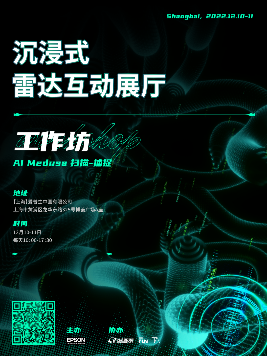 现在,爱普生中国作为主办方,联合TEA Community 新媒体社区举办《沉浸式雷达互动展厅工作坊》,此次工作坊也是2022年光点国际新媒体艺术节一个很重要的环节。并会围绕“AI Medusa 扫描-捕捉”的艺术主题进行现场教学创作。