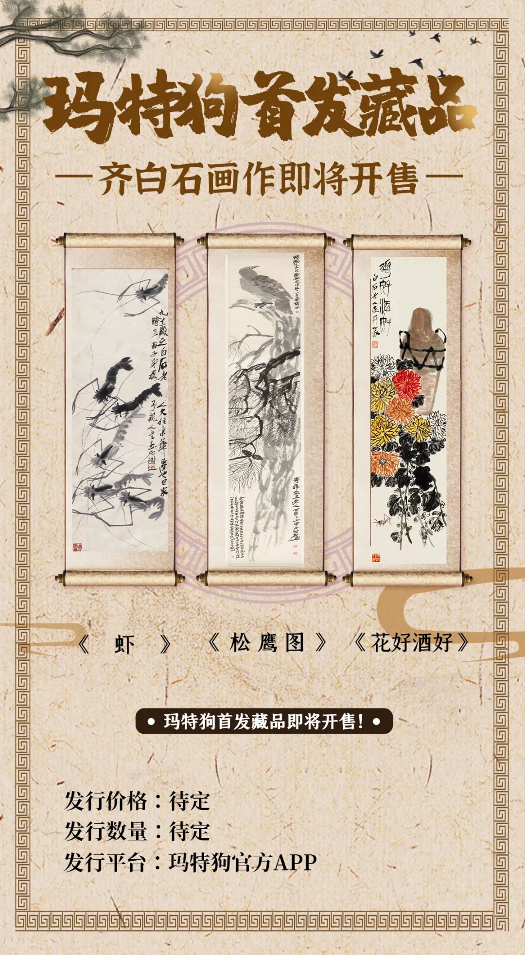 更令人激动的是,玛特狗与中国文化艺术发展促进会新丝路艺术工作委员会达成合作,将为首批用户带来近现代绘画大家齐白石数字藏品,用数字科技赋能传统艺术。藏品集合齐白石的三幅国画珍品《虾》、《松鹰图》、《花好酒好》,画作现估值均上千万。请提前下载APP,关注藏品动态。