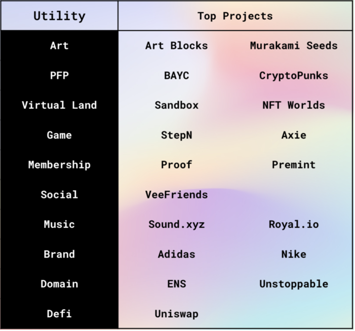 NFT快速发展至今,所涉及的领域已经远远超越了传统的艺术品/收藏品。越来越多类别的NFT大规模涌现。这也意味着,NFT正在应用到我们生活经济的方方面面,包括房地产、内容创作、游戏、在线社区、音乐会和其他有趣的领域,这些当前存在市场上的领域初步统计可以分成十大类别(下图)。