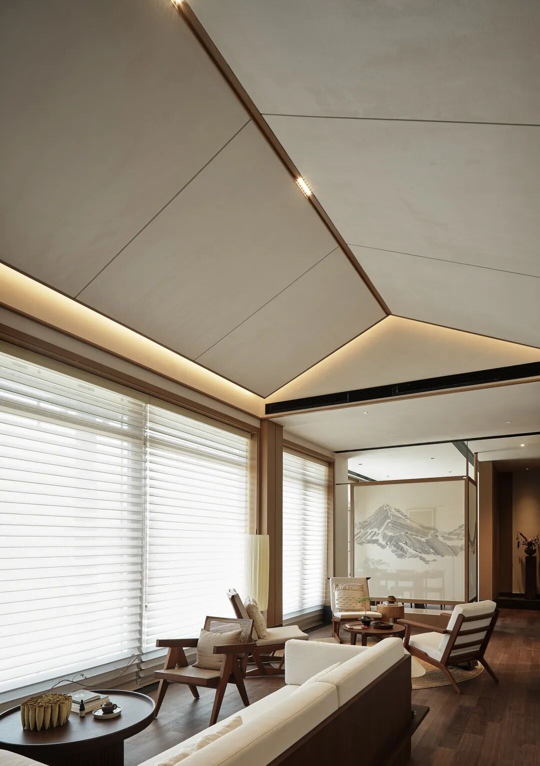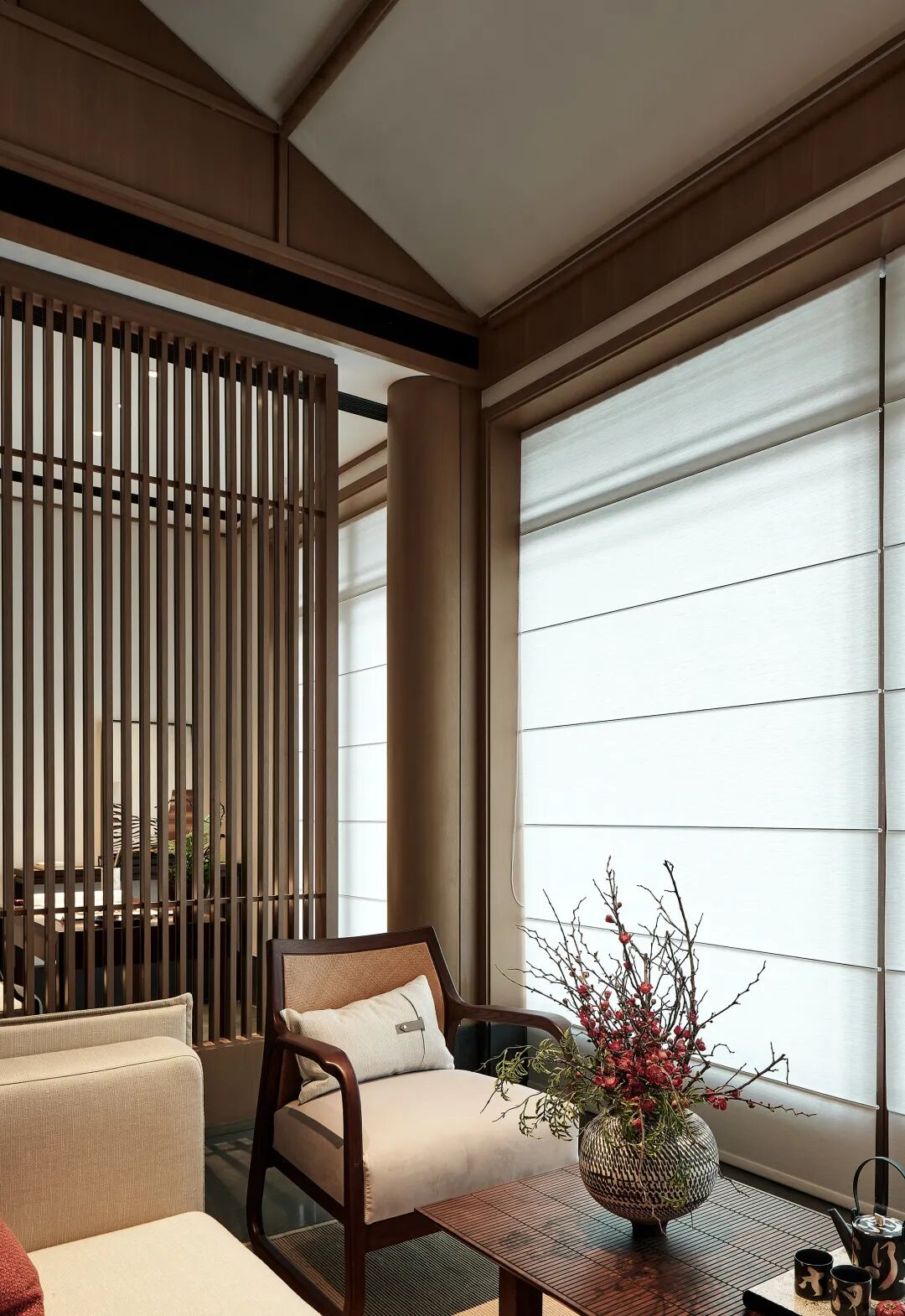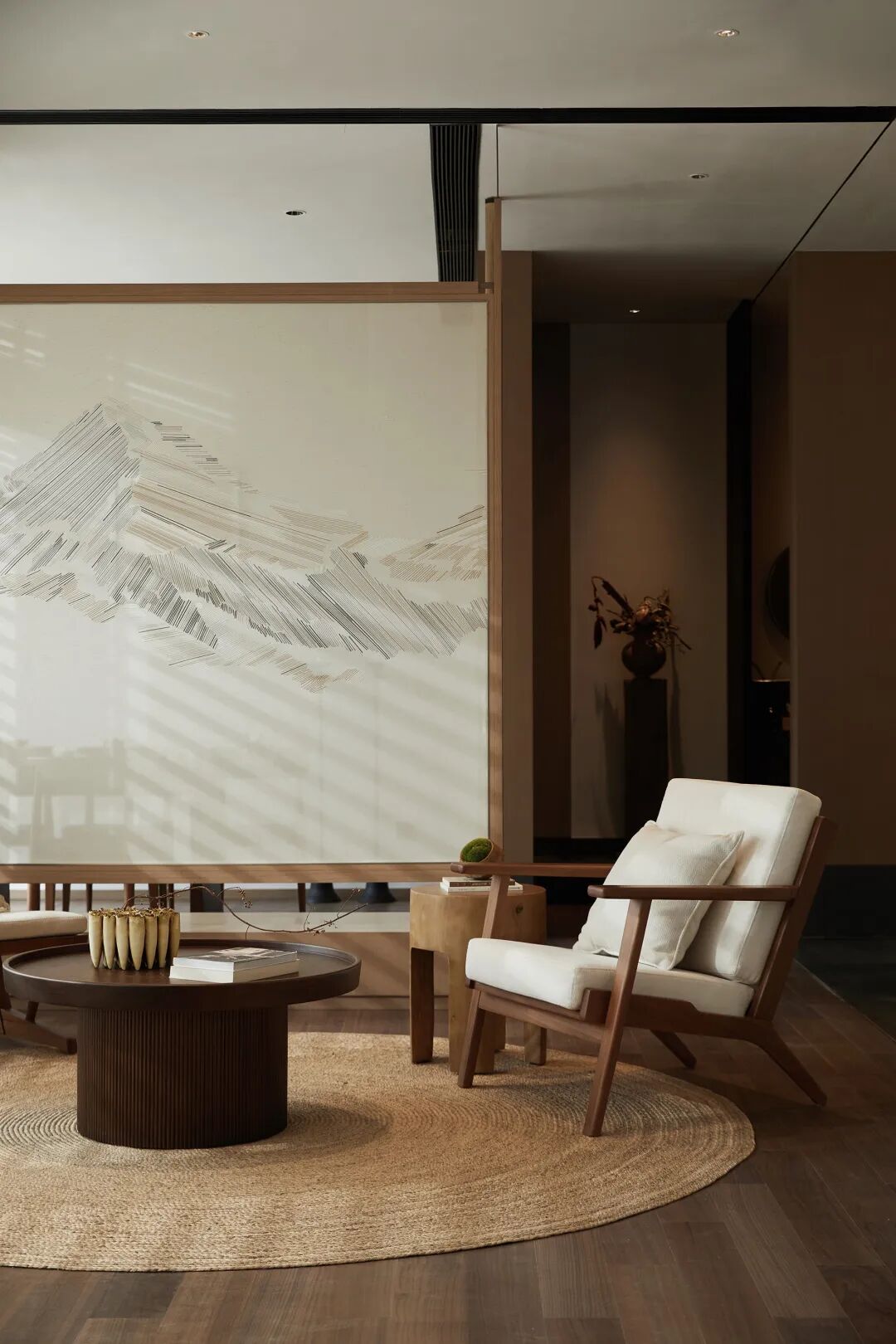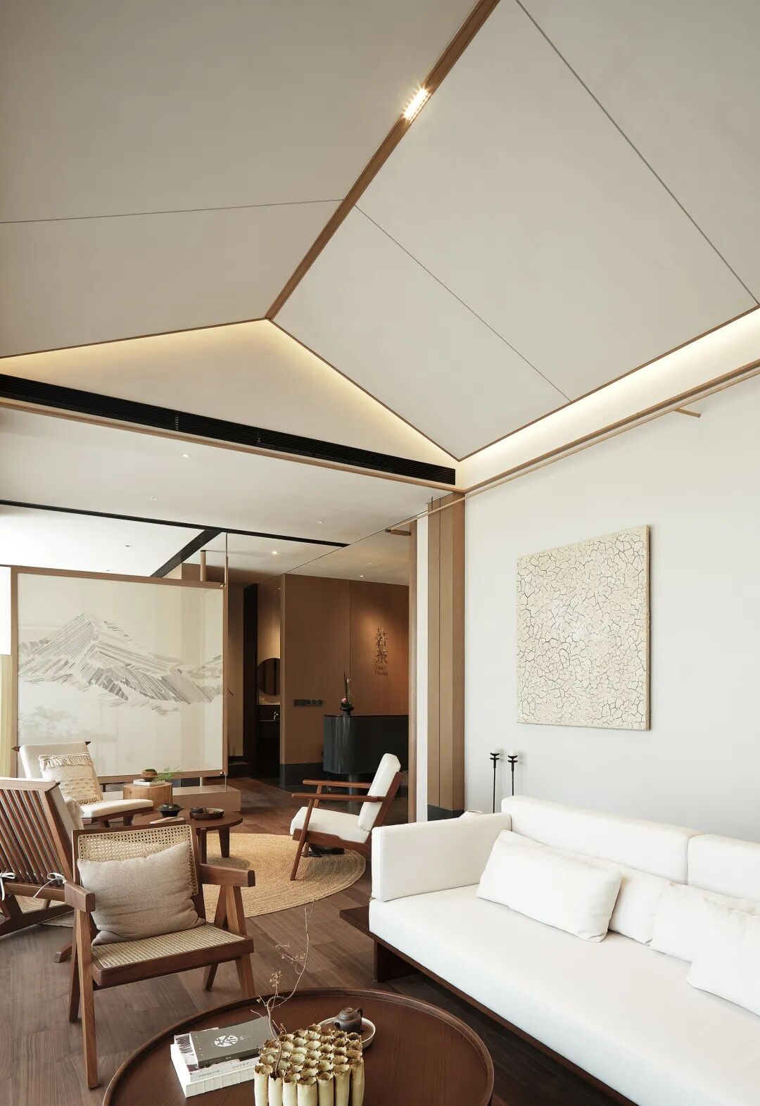 室内吊顶以中式坡顶为原型进行简化,呼应禅意这一主题。不同于展示区对自然元素的对话和运用,社交客厅的自然元素主要通过落地窗实现人与自然的视线交汇。