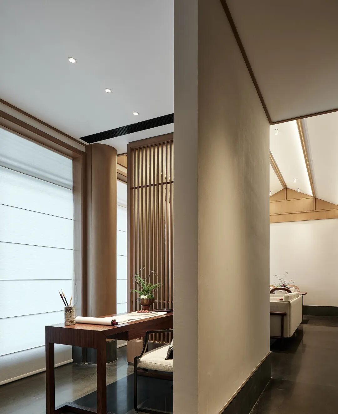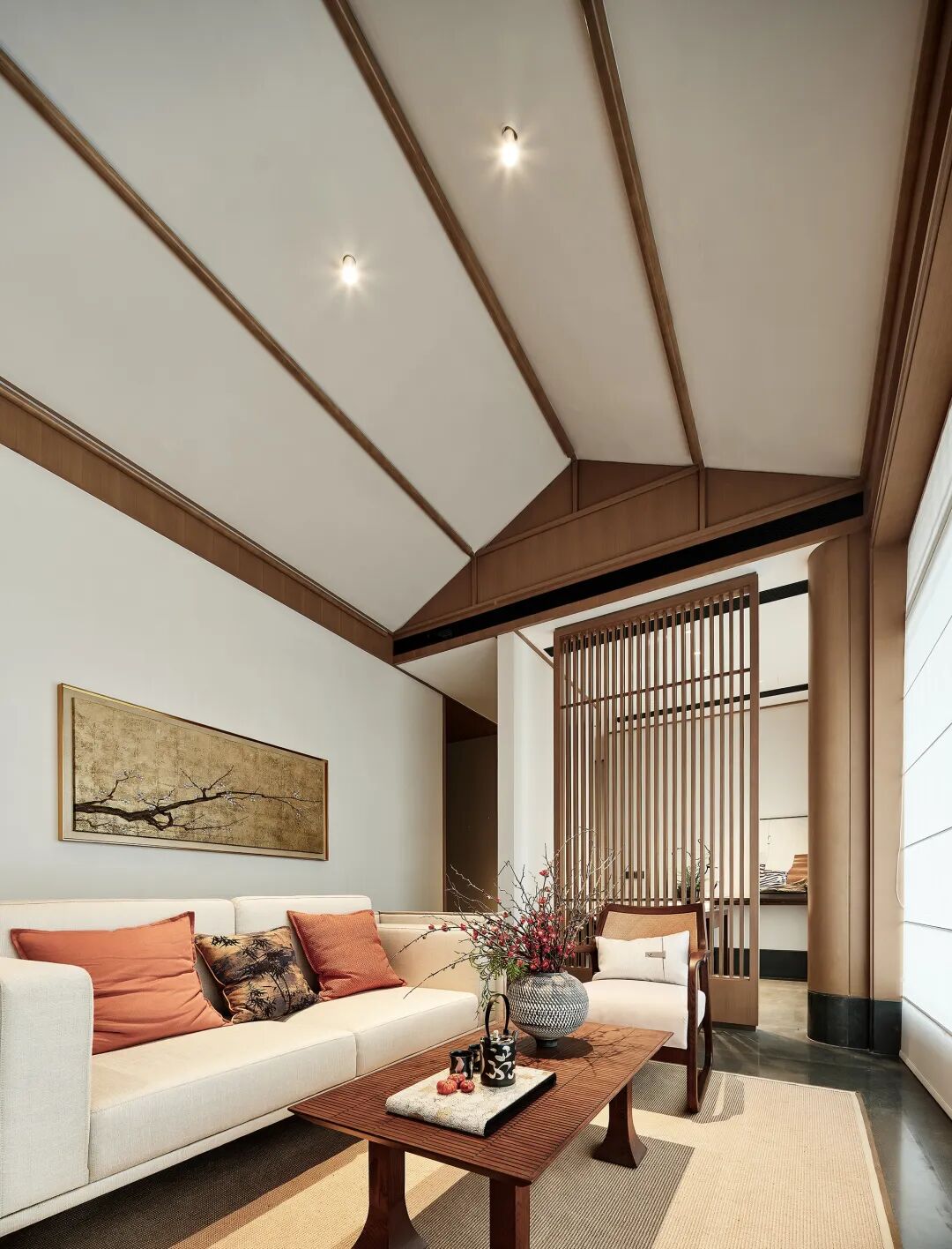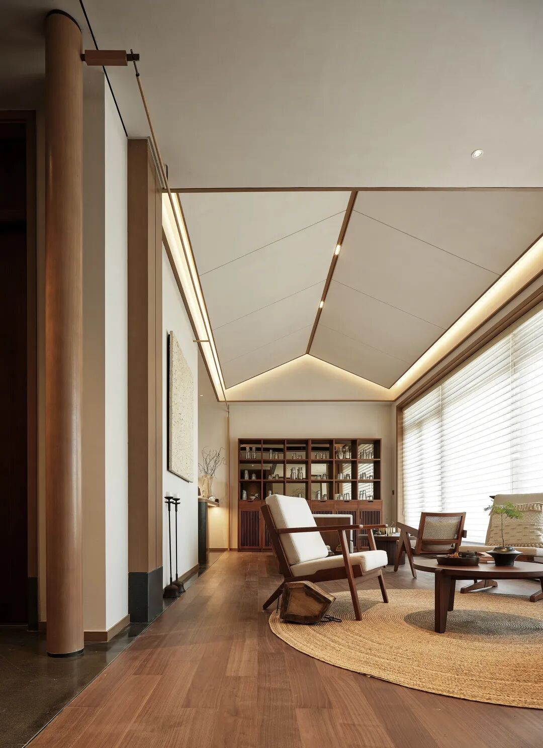 室内吊顶以中式坡顶为原型进行简化,呼应禅意这一主题。不同于展示区对自然元素的对话和运用,社交客厅的自然元素主要通过落地窗实现人与自然的视线交汇。