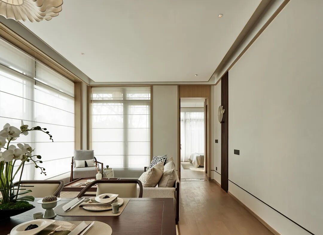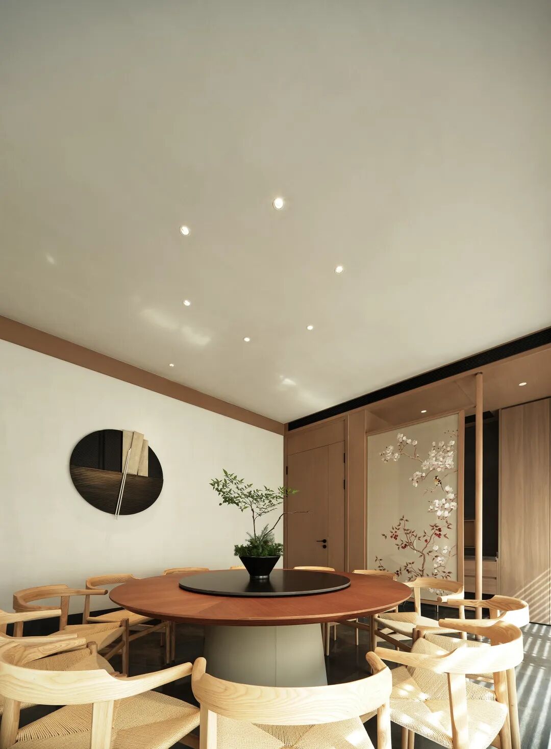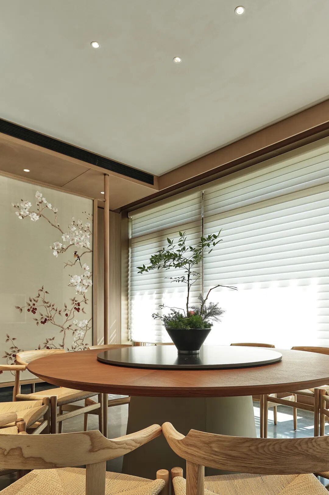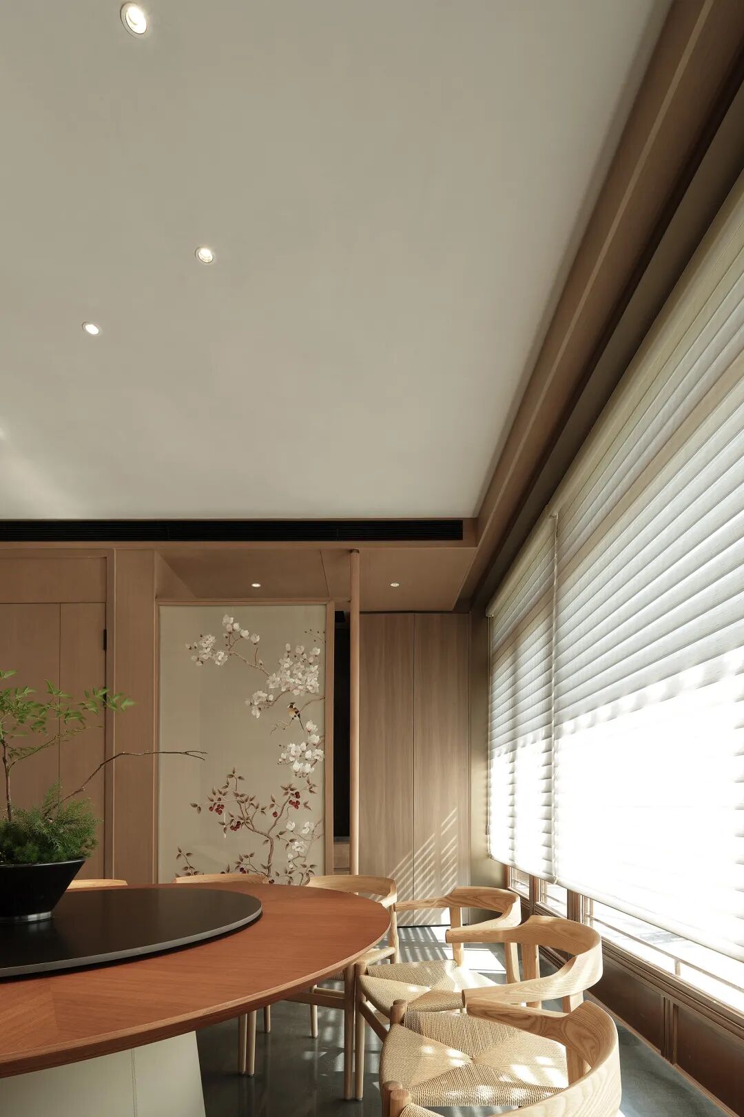 室内吊顶以中式坡顶为原型进行简化,呼应禅意这一主题。不同于展示区对自然元素的对话和运用,社交客厅的自然元素主要通过落地窗实现人与自然的视线交汇。