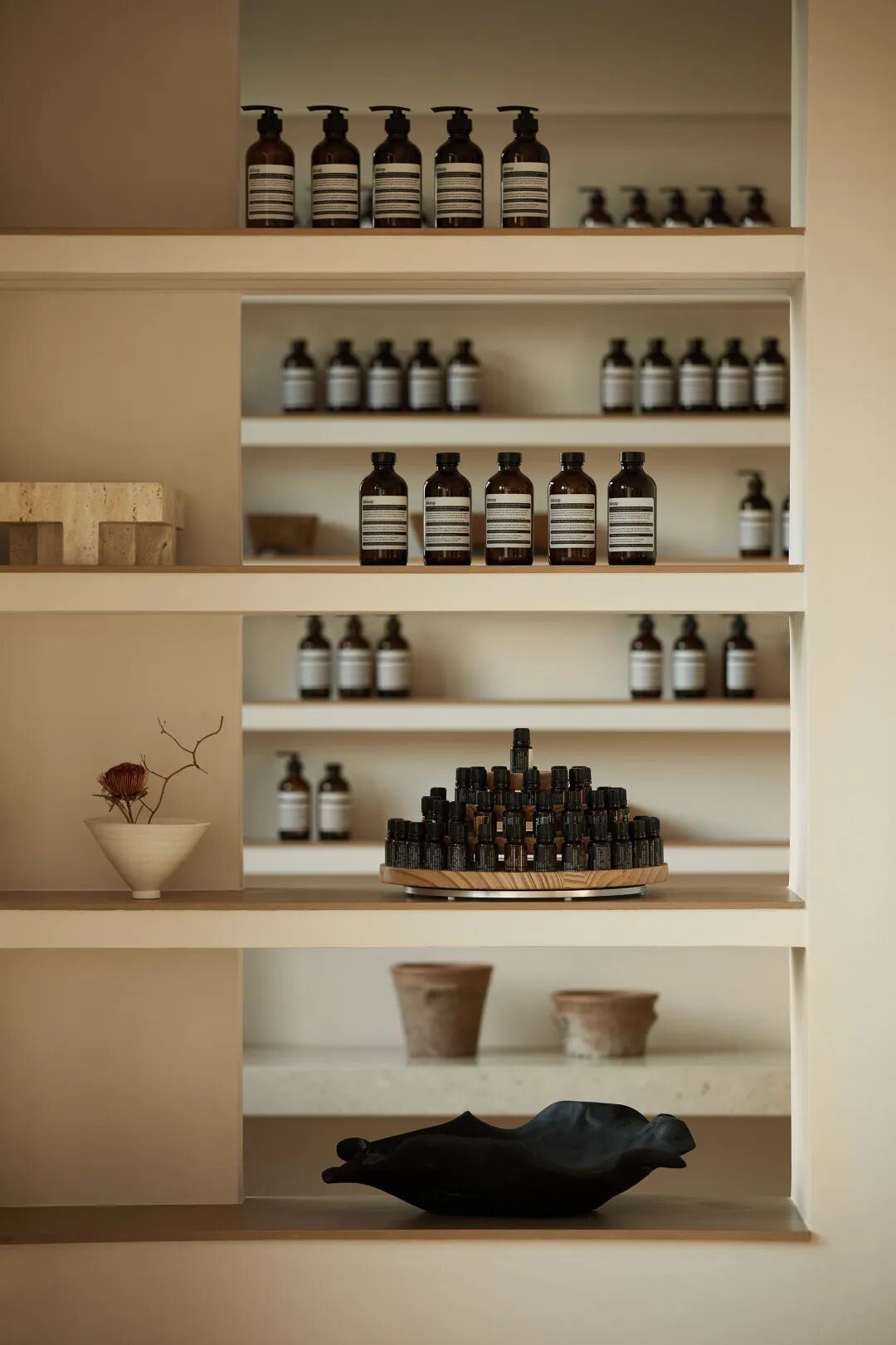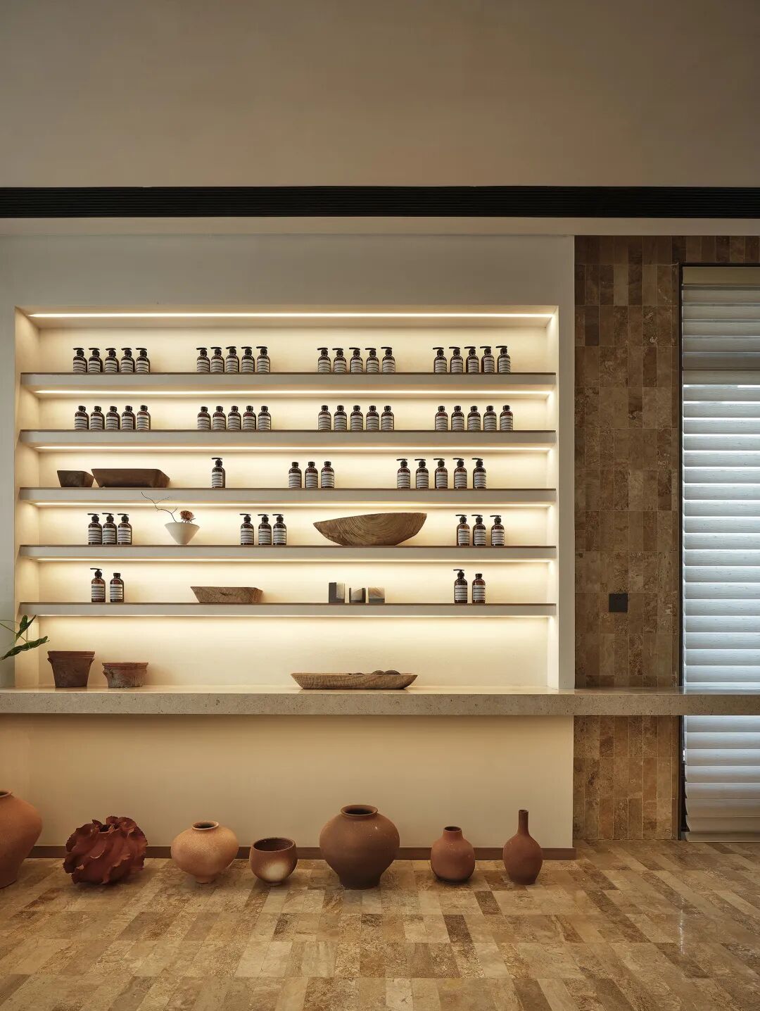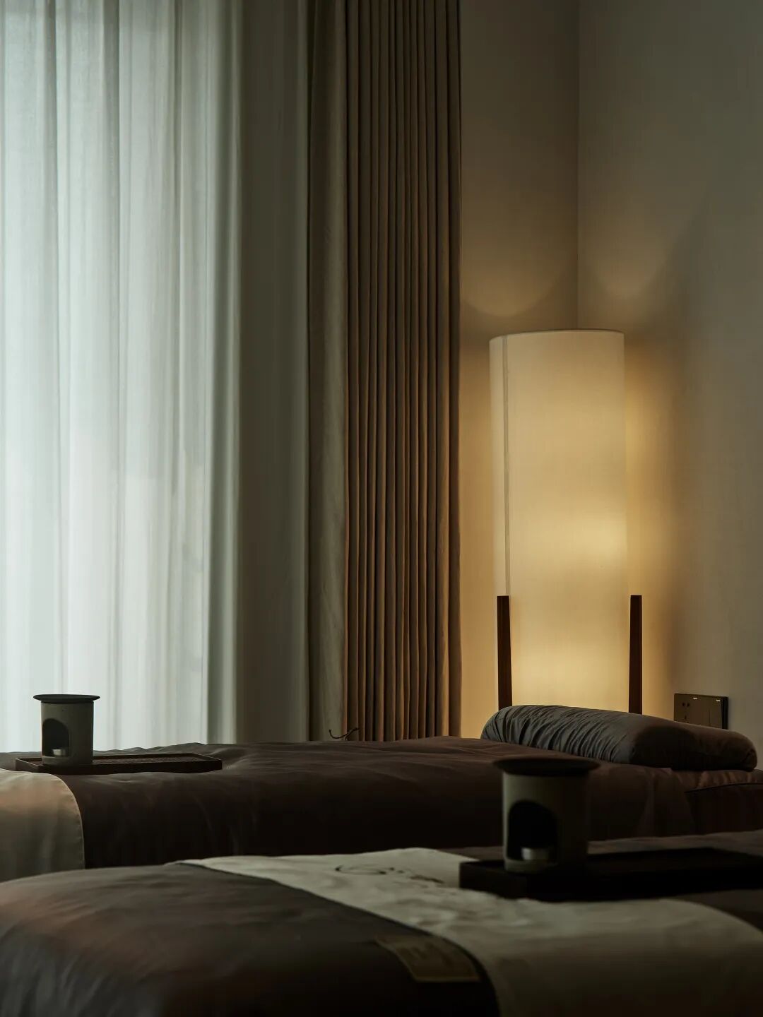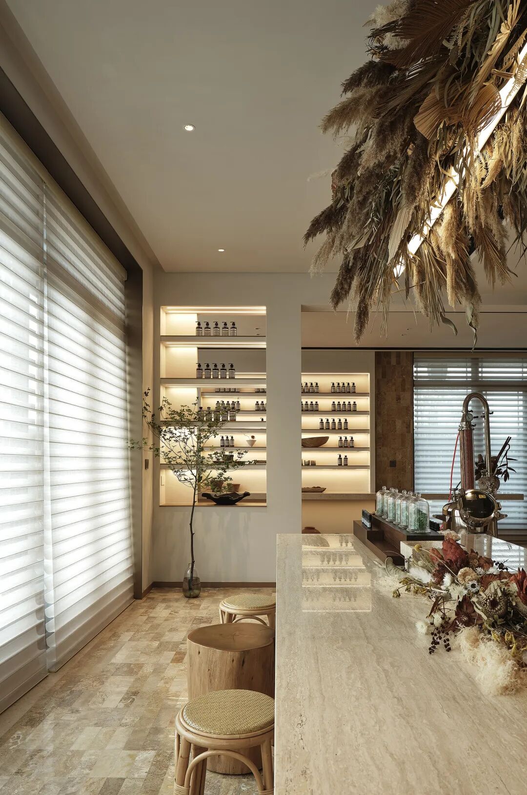 Spa区和客房采用颜色较深的颜色搭配和光影效果,为在此休息的客人提供一个舒适的养生场所。从芳香展示区整体来看,设计都尝试向外界传达一种避世、度假、花园、惬意的生活理念。
