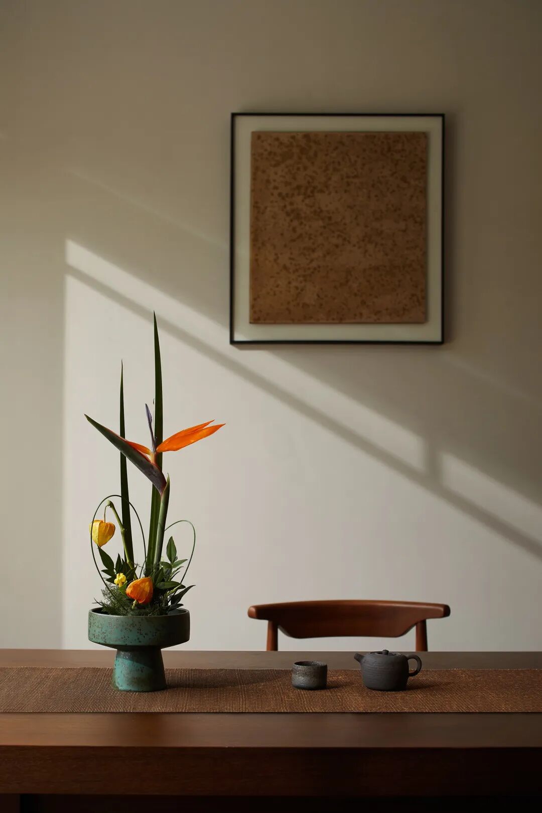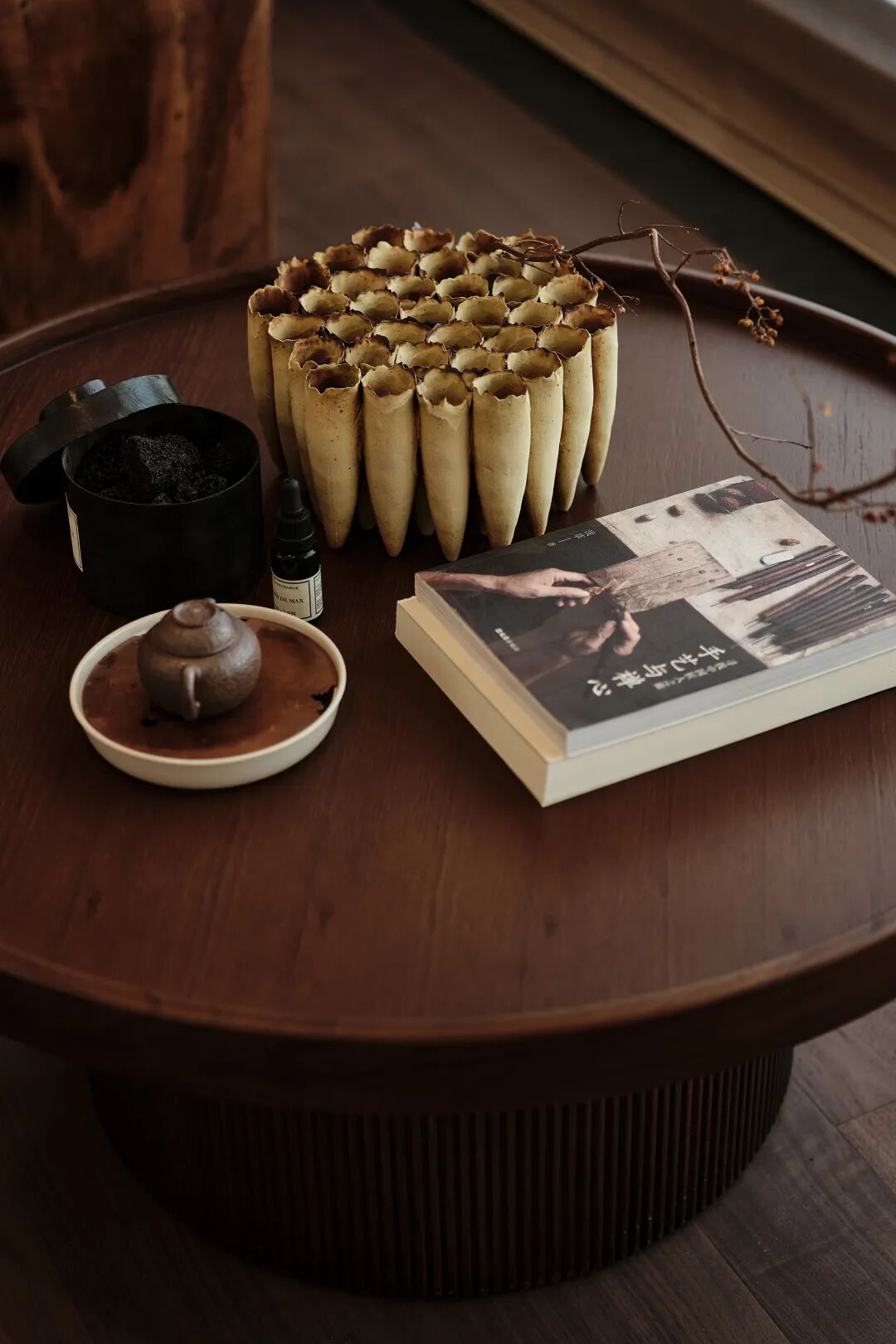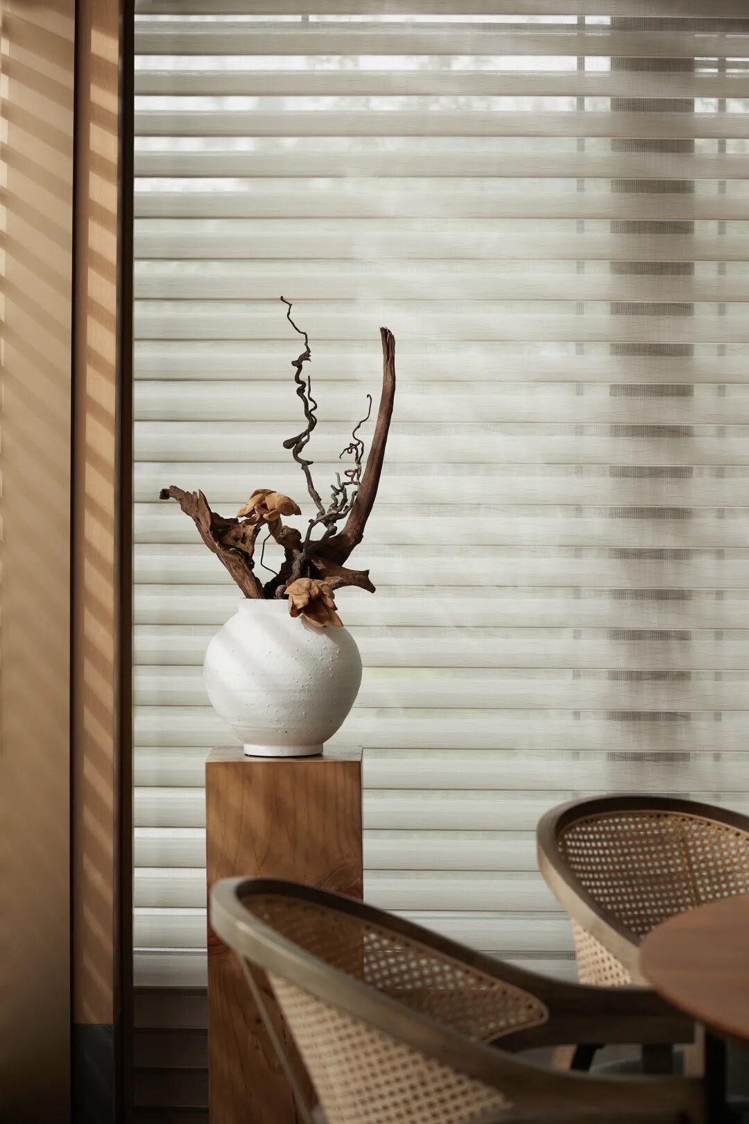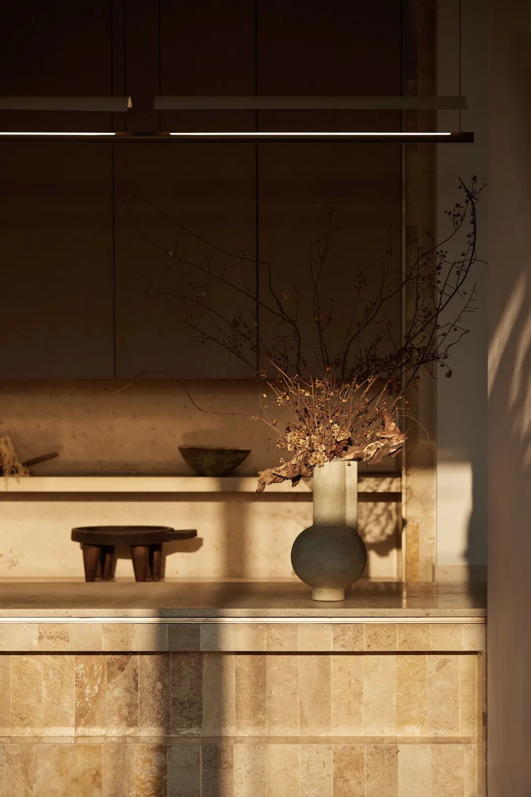 精致的器皿里蕴含着使用者在生活中所追求的仪式感,在入口软装的选型上,融入了一些自然意向,结合矮凳和条桌的选型,放大了空间的禅意氛围,并增加了人们在此处发生交流的可能性。