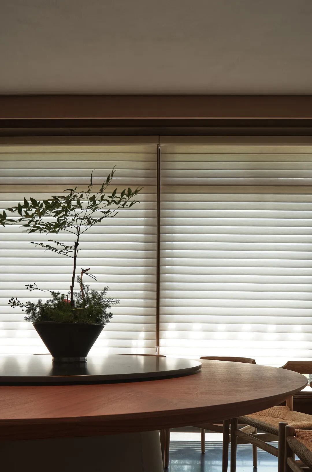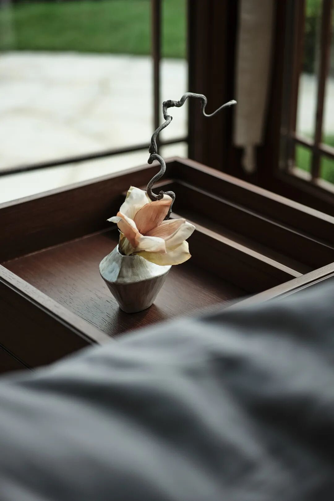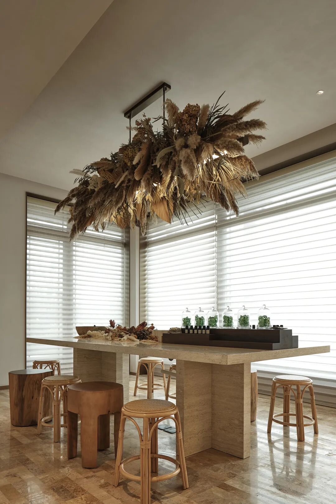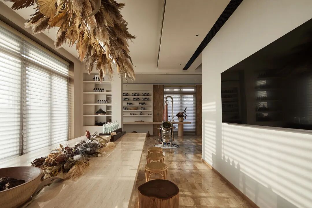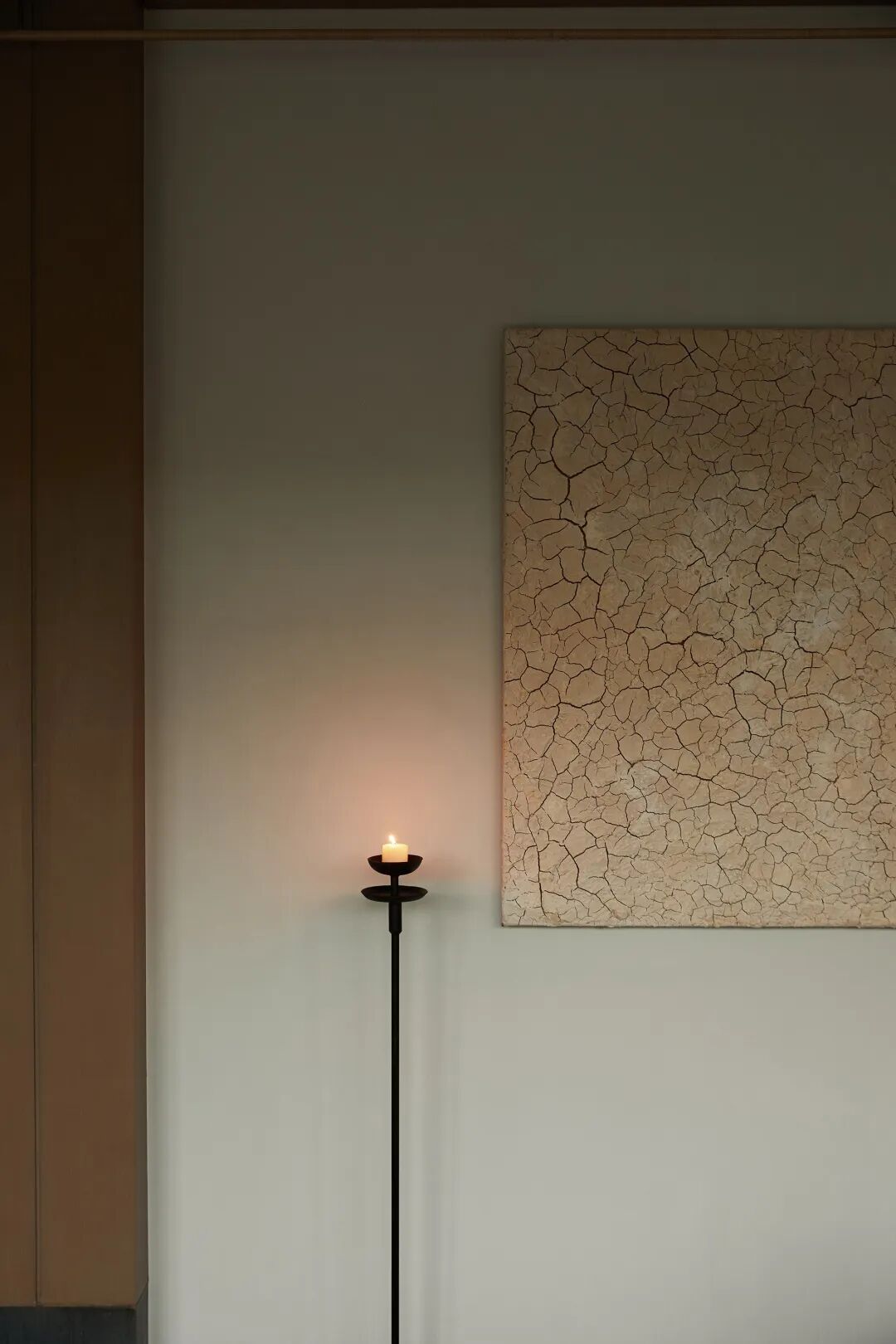 精致的器皿里蕴含着使用者在生活中所追求的仪式感,在入口软装的选型上,融入了一些自然意向,结合矮凳和条桌的选型,放大了空间的禅意氛围,并增加了人们在此处发生交流的可能性。