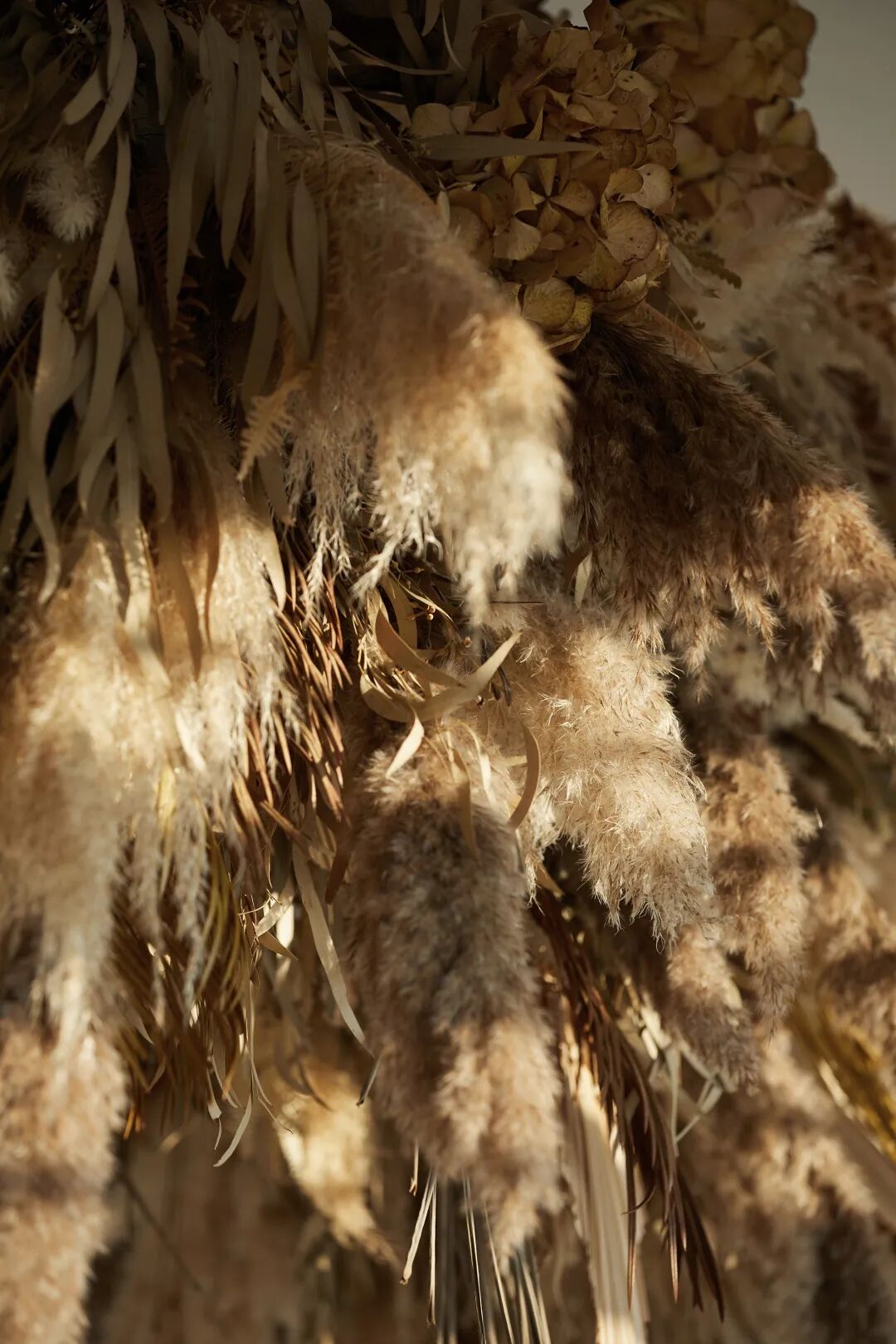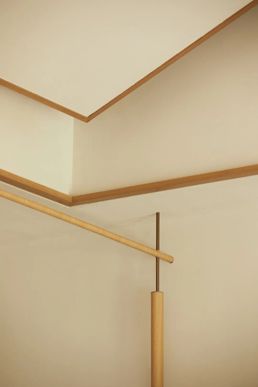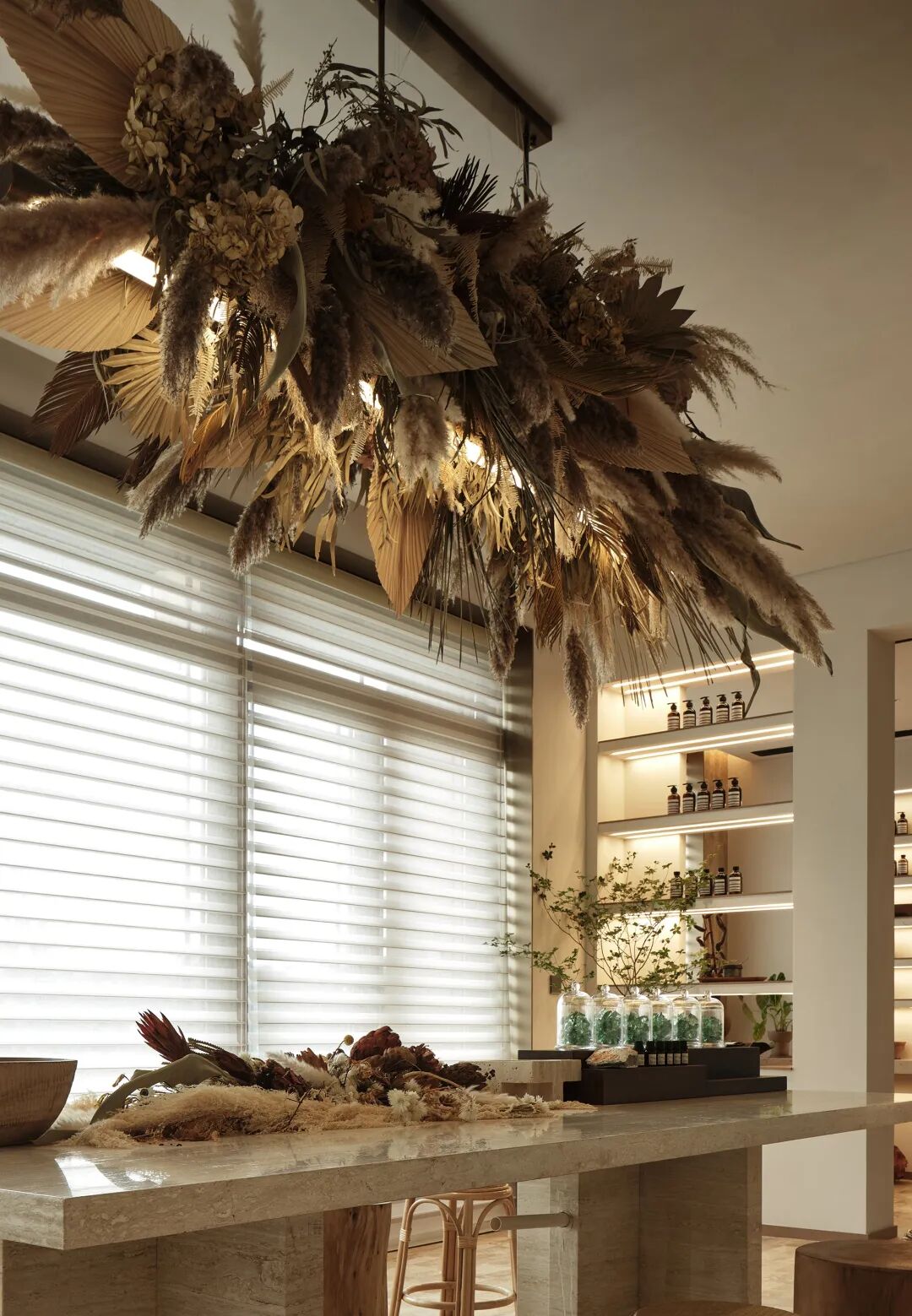 多种木质的混合,结合在室内装置上添加的顶棚吊花,也强调了整体空间的草木质感。家具选型又以手工艺术风格制品为主,强化了这种的氛围感受。
