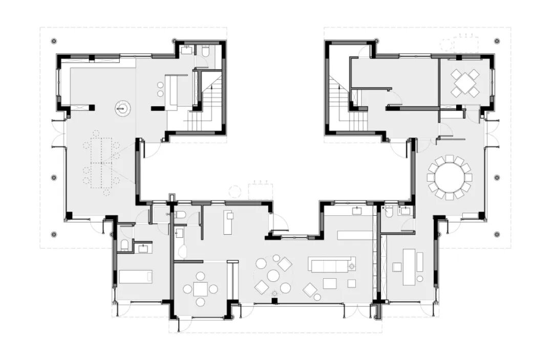 作为相对动态的会所及小镇的体验区域,设计者按照其空间需求功能,划分为以“花”和体验为主的芳香区、以会谈与社交为主的“茶”主题社交客厅、以及以“食”为主题的私宴会所。三个不同空间区域借由彼此互联的动线关系,被统一在同一系统内,并向各自的庭院延伸。