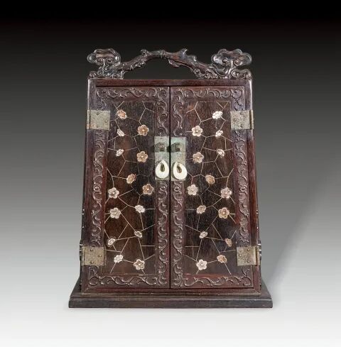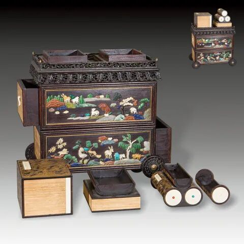 清紫檀描金嵌宝山水人物纹箱车文房盒