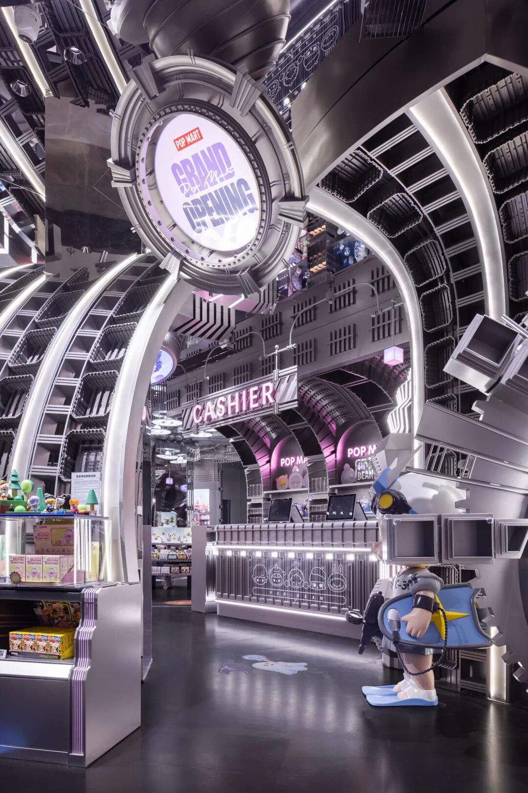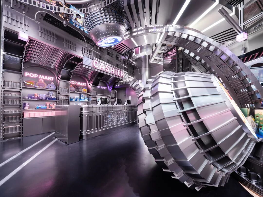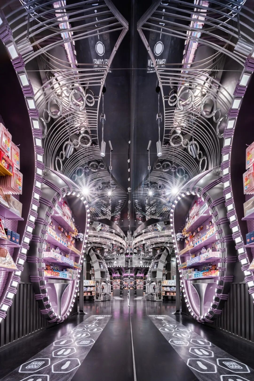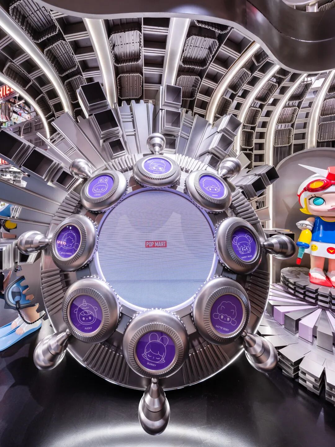 空间里散落着多个镶入电子屏的大型球体货架,屏幕上播放着POPMART潮玩情报,像是这个银色机械之星的控制心脏,指挥着天花板上的传送带有序运送潮玩产品。拱形展示架蔓延至天花,成列排布出一种秩序的美感,地面的圆弧型货架摆满了潮玩和衍生品,串联起顾客的探索路径。天花上悬挂缀连成链的球形展示盒,经由镜面的辉映,统筹出一个充满机械建筑感的新奇之地。
