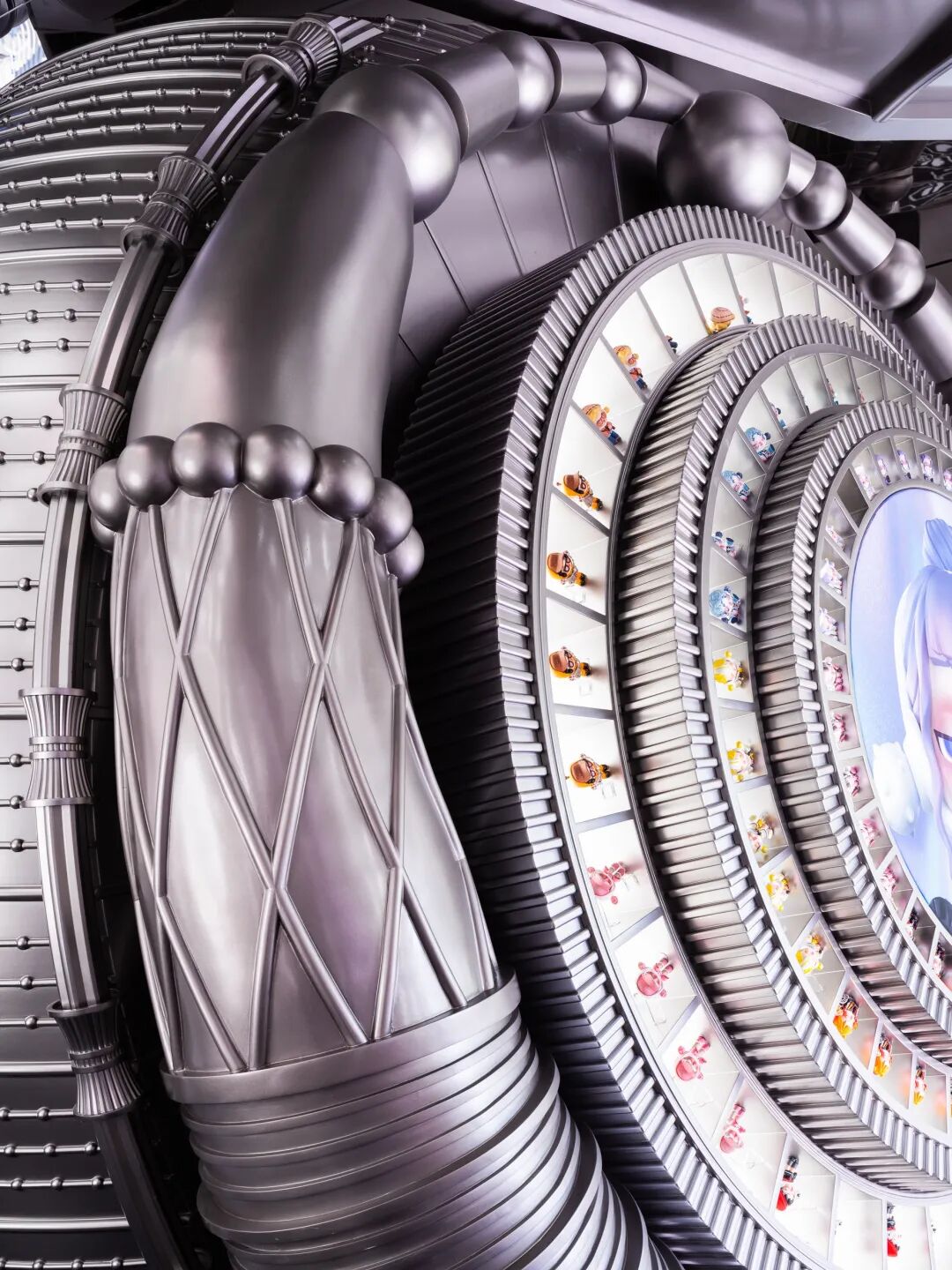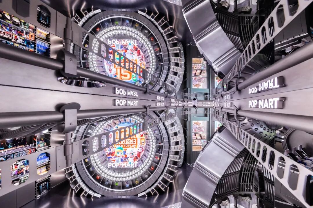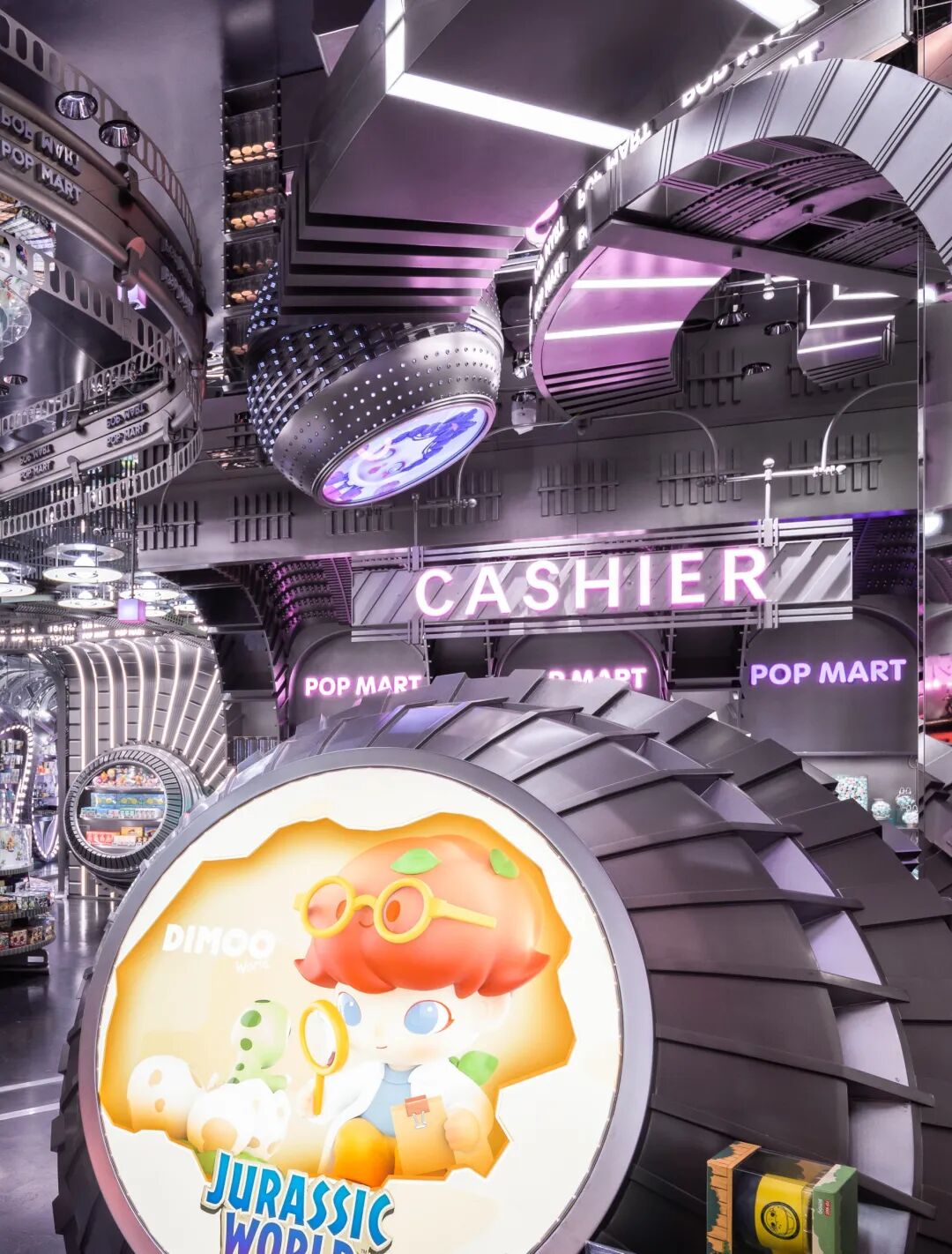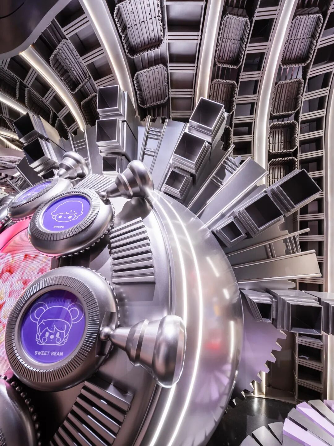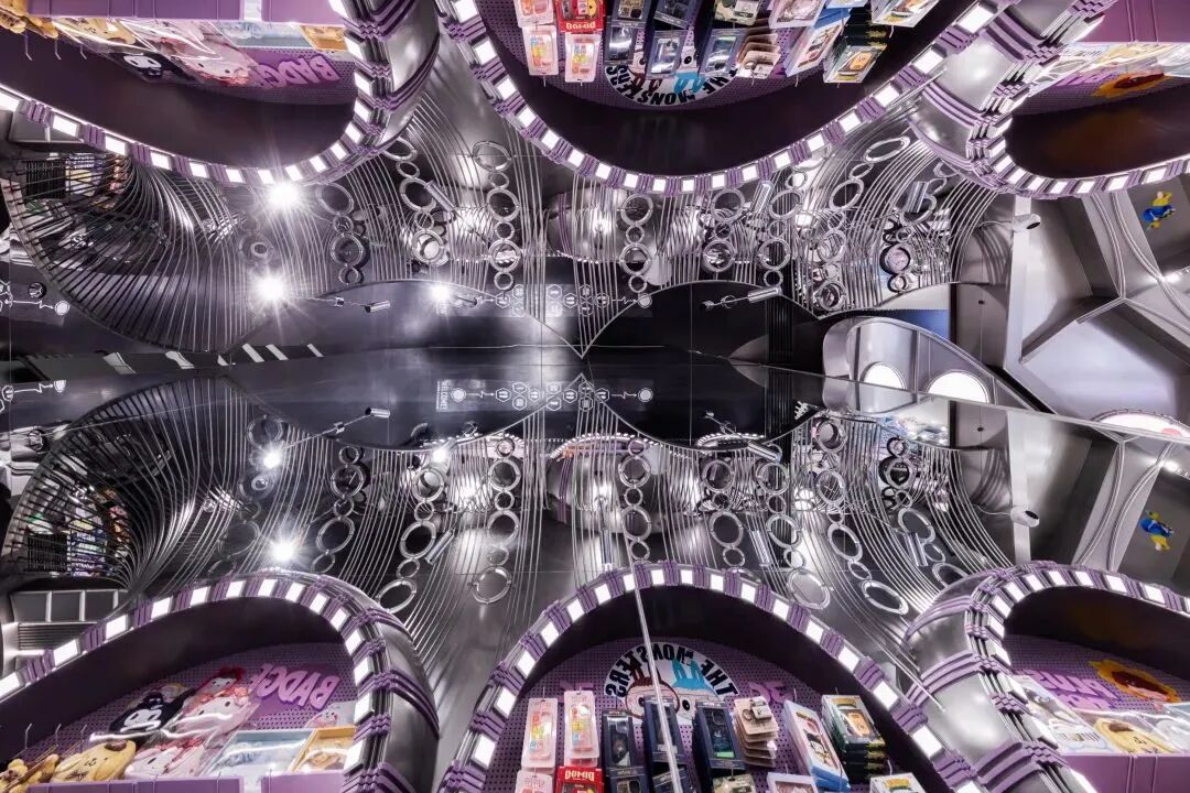 空间里散落着多个镶入电子屏的大型球体货架,屏幕上播放着POPMART潮玩情报,像是这个银色机械之星的控制心脏,指挥着天花板上的传送带有序运送潮玩产品。拱形展示架蔓延至天花,成列排布出一种秩序的美感,地面的圆弧型货架摆满了潮玩和衍生品,串联起顾客的探索路径。天花上悬挂缀连成链的球形展示盒,经由镜面的辉映,统筹出一个充满机械建筑感的新奇之地。