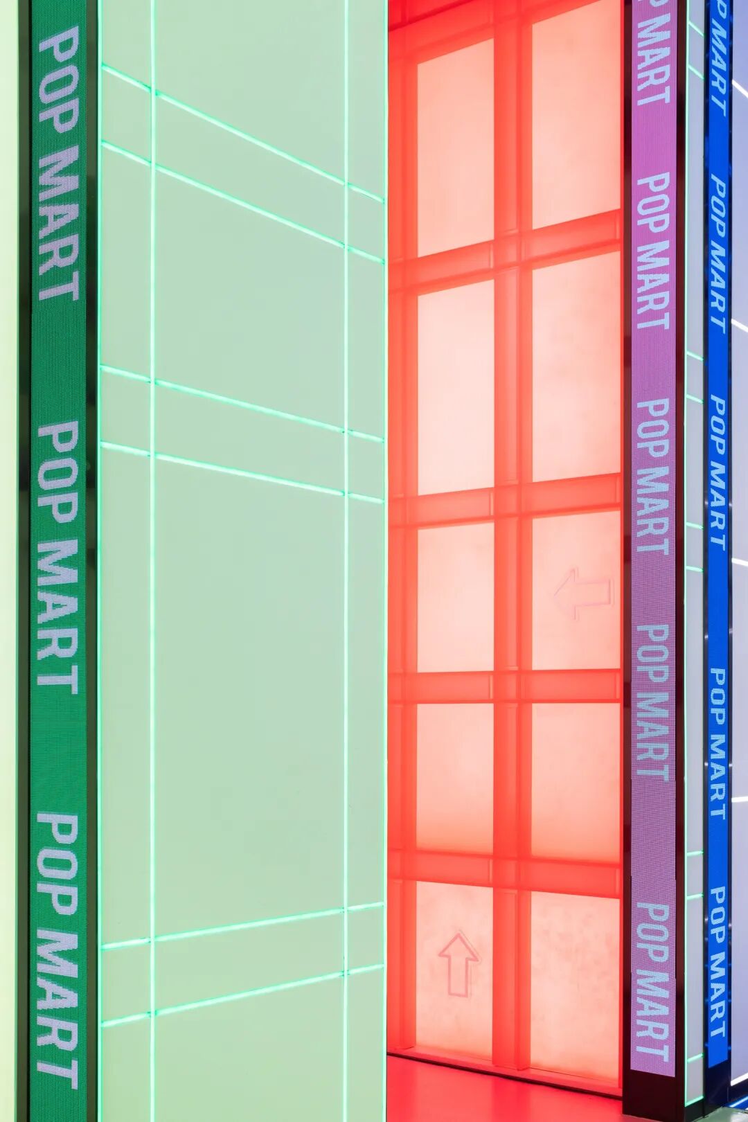 用色彩张扬个性,反扣POPMART态度鲜明的潮玩产品,呼应倡导年青力的品牌调性。彩色亚克力材料的使用覆盖至规则方形陈列柜到异形展架,设计师从色彩到造型定制工艺的极尽考究,才最终营造出精致通透的琉璃般质感,展现品牌潮流感的同时,打破了零碎分区之间的视野局限性。