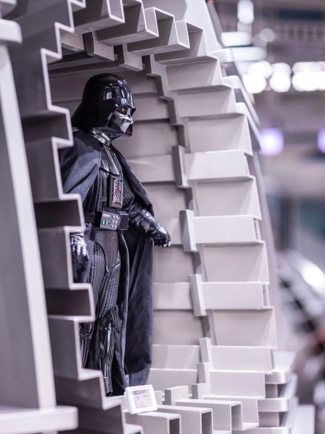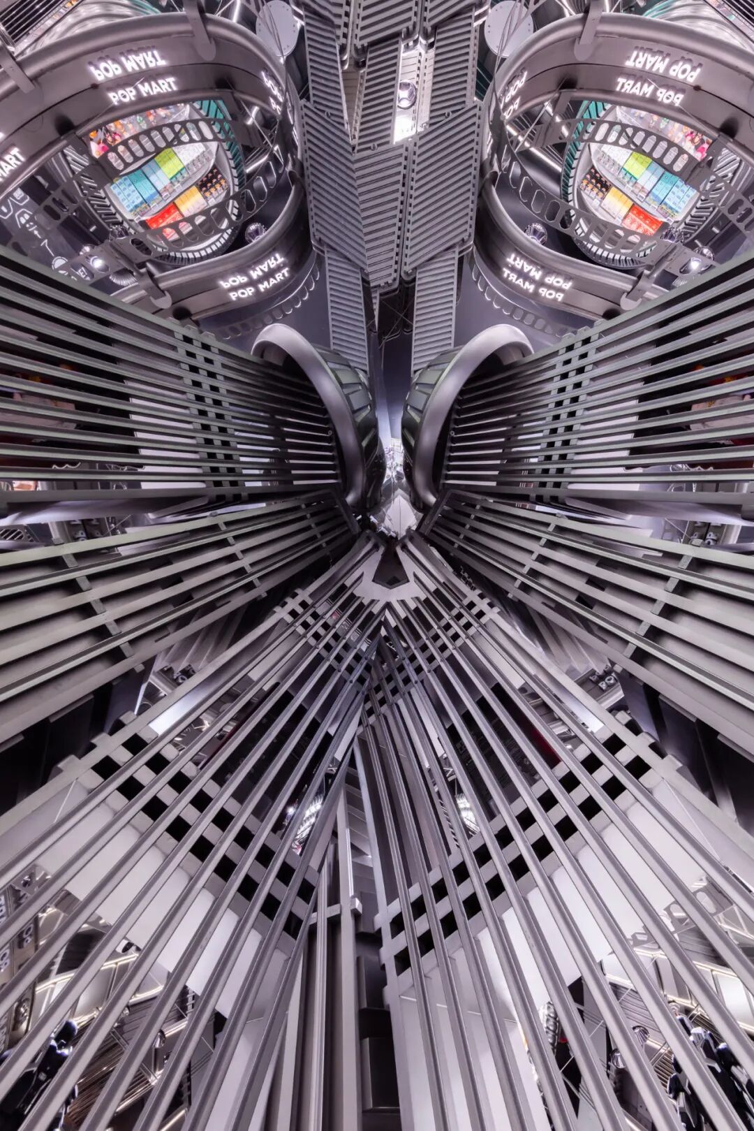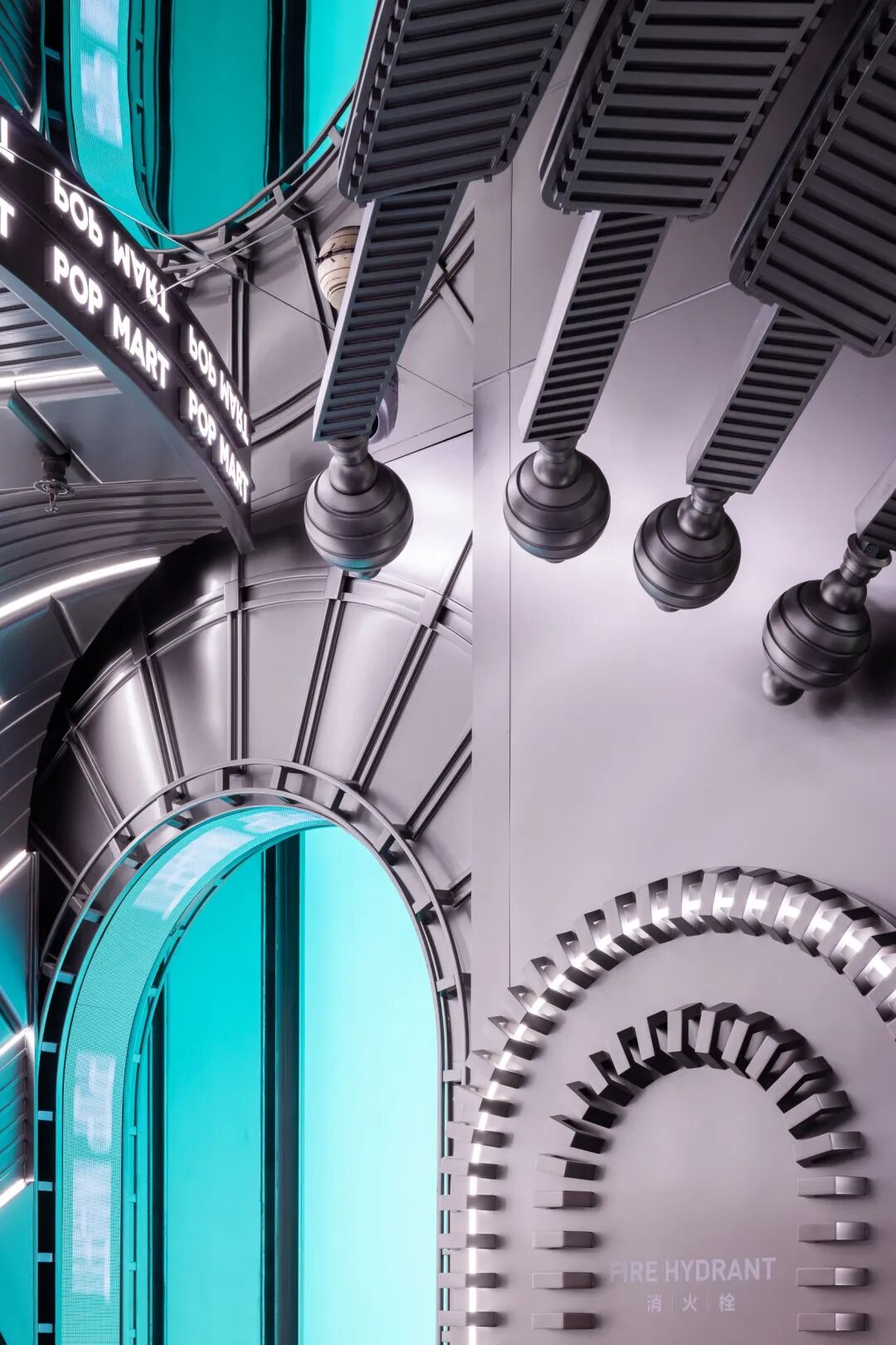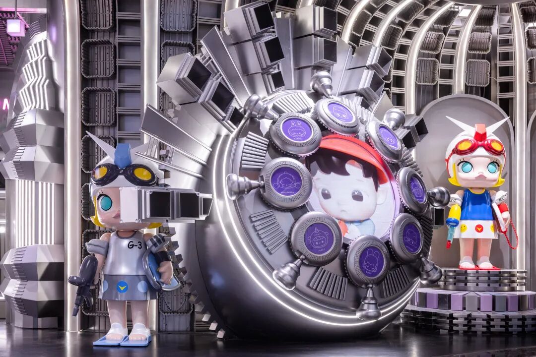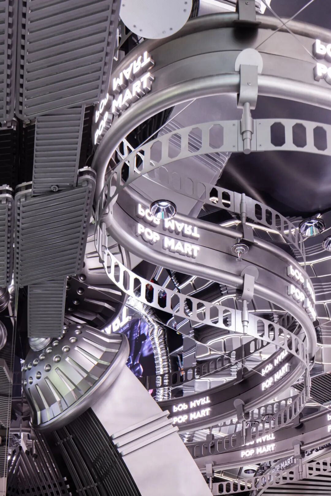 大片银色强势而不容抗拒地侵入视野,机械质感浓重的构件描摹出空间的表皮肌理。品牌标志性IP人物MOLLY化身星河水手,抵达了宇宙中未曾有人到过的POPMART秘密星球。充满未来感的科技机械杆件,依循植物生长般的发展态势,呈现出一个假想中的未来新世界,更加深了空间叙事的戏剧张力。
