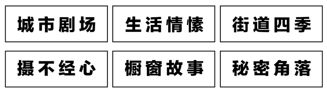 ——城市剧场、生活情愫、街道四季、摄不经心、橱窗故事、秘密角落,六个部分随性的分类,因循着在城市行走过程,在我脑中形成不同的关键词,还有照片之间各种说不清的印象关联性。