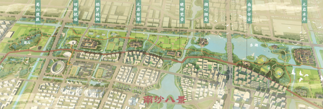 以轴向组合中心引动腹地空间,两侧布局多个未来社区组团,并以环形公服走廊连接社区中心,在江东大道和南沙大堤之间规划南沙未来社区样板。