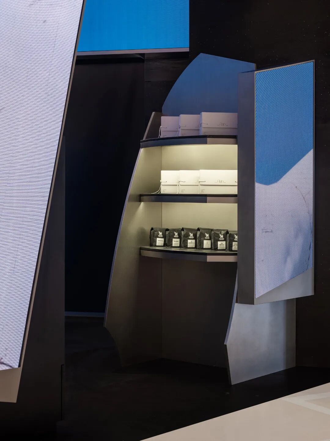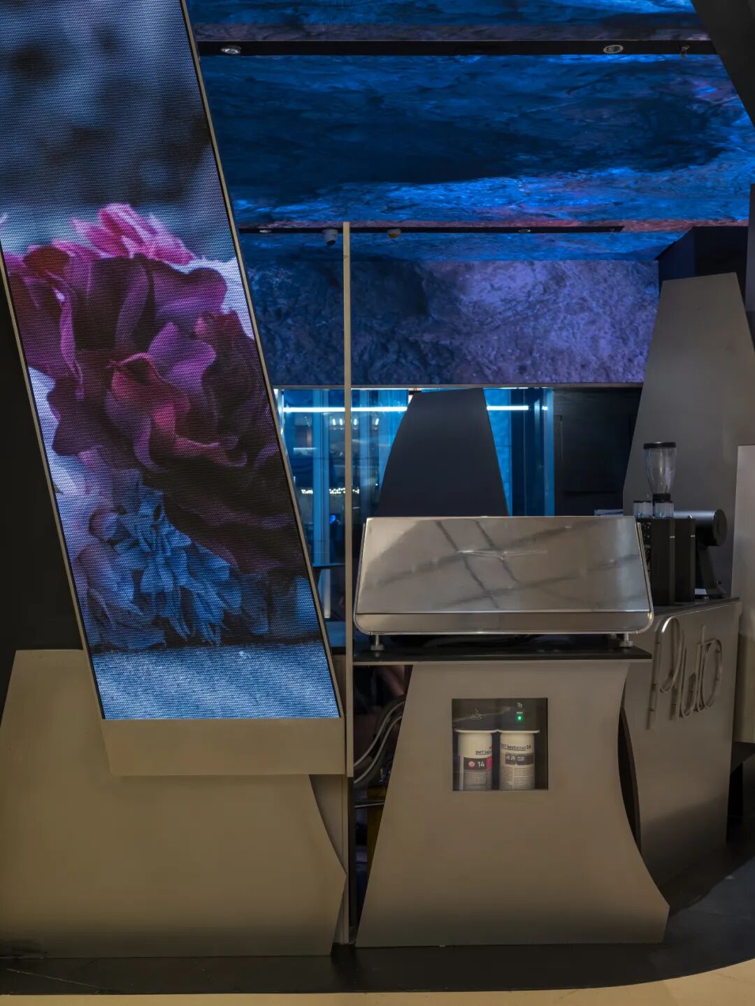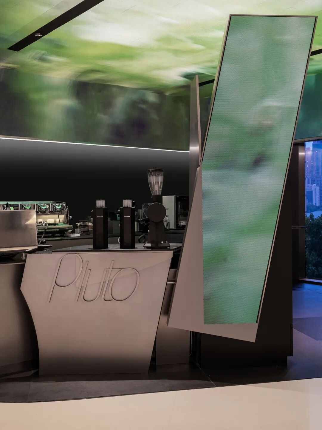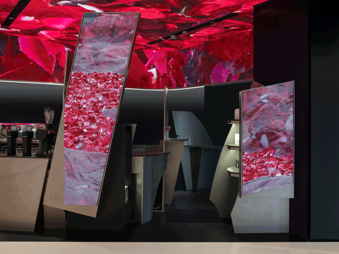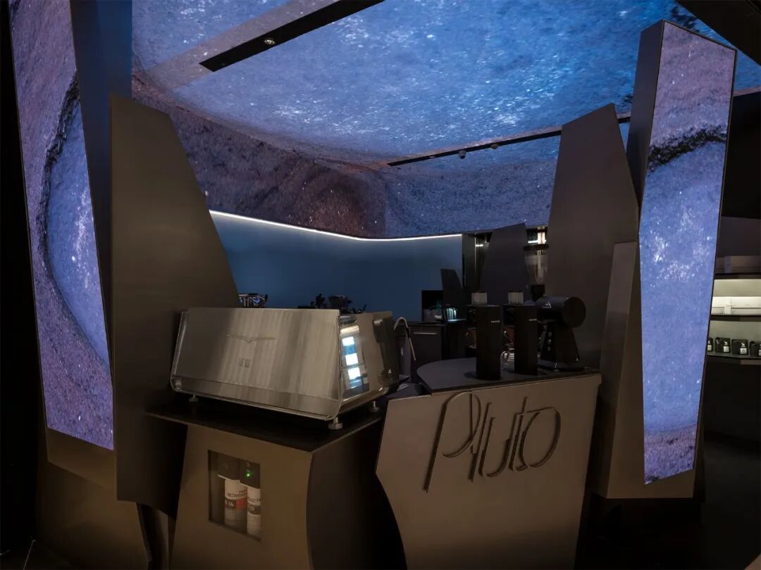 在我们的理解中,PLUTO咖啡的意图是将视觉艺术置于咖啡吧台的中心,通过拱顶的屏幕使其更好的营造环境氛围,激活空间,并与在四处点缀的垂直屏幕一起强调了整个艺术空间的层次感。