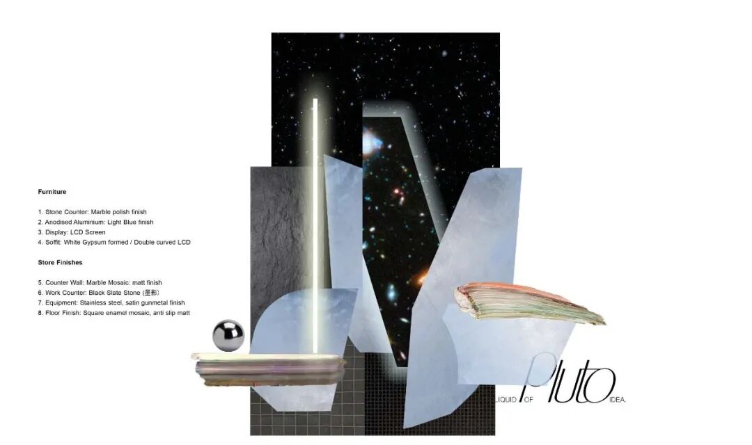 设计的灵感来源是冥王星在太阳系中区别于其他行星独特的存在,整体的空间呈现是我们对于这颗星球充满争议性的存在做出感性的回应。
