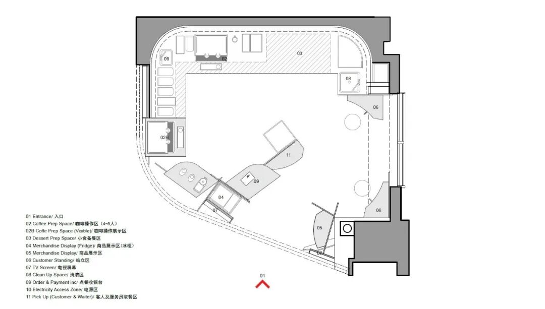 所以在设计过程中,我们将这种情感具象化为一个个孤立的剪影,用剪影勾勒并塑造空间。通过推敲构图与排列,这些阴影元素相互融合协调,形成了一个具备社交属性的环境,映射了咖啡的美学内核——通过一粒粒不起眼的棕色豆子,将一个个犹如孤独剪影的人们聚集于此,通过设计的空间提供社交的环境,让人们不再孤独。