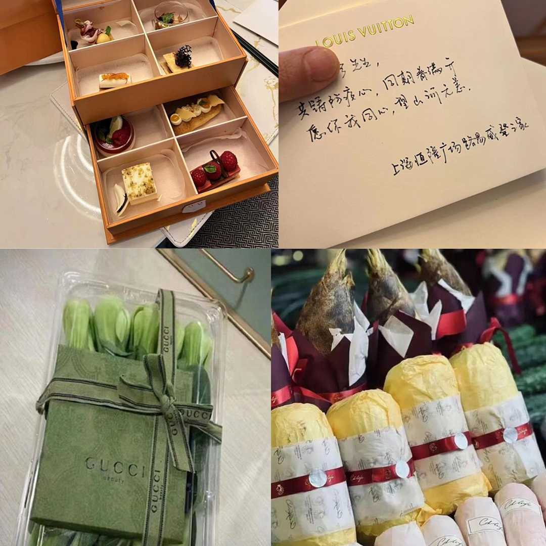 在送菜这样一件看似接地气的事情上,奢侈品公司仍然保持着认真考究,菜品被包上品牌专属色彩的带LOGO的外包装,系上了丝带。