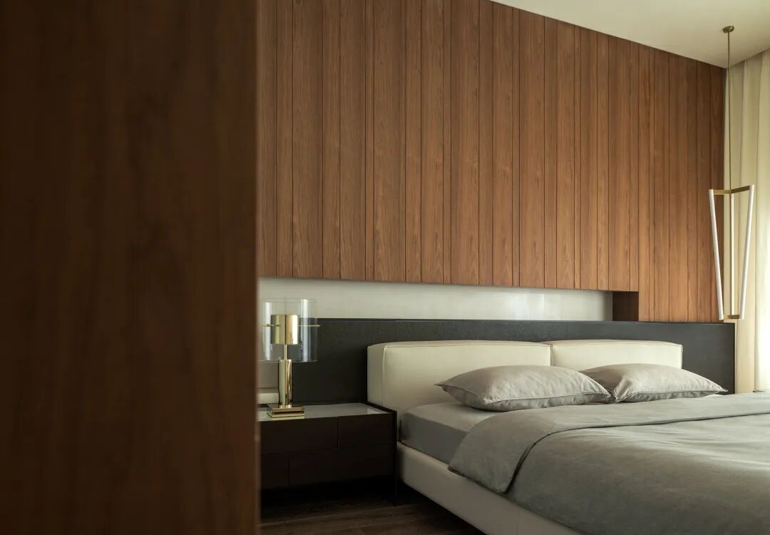 温煦底色讲述着安静的力量,也诠释出家的舒适与归属感。墙体本身、木饰面与烤漆柜亲密叠加、有序配合,简洁色调、干练块面、饱满层次融合为一。顺势延展之际,也均暗藏充沛的收纳,表象所见之外更具功用本质。