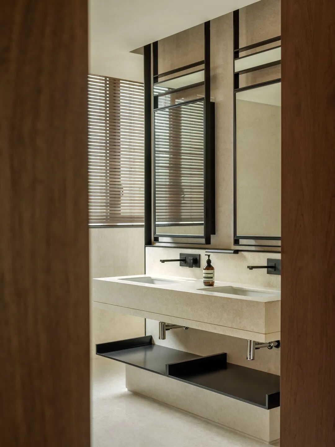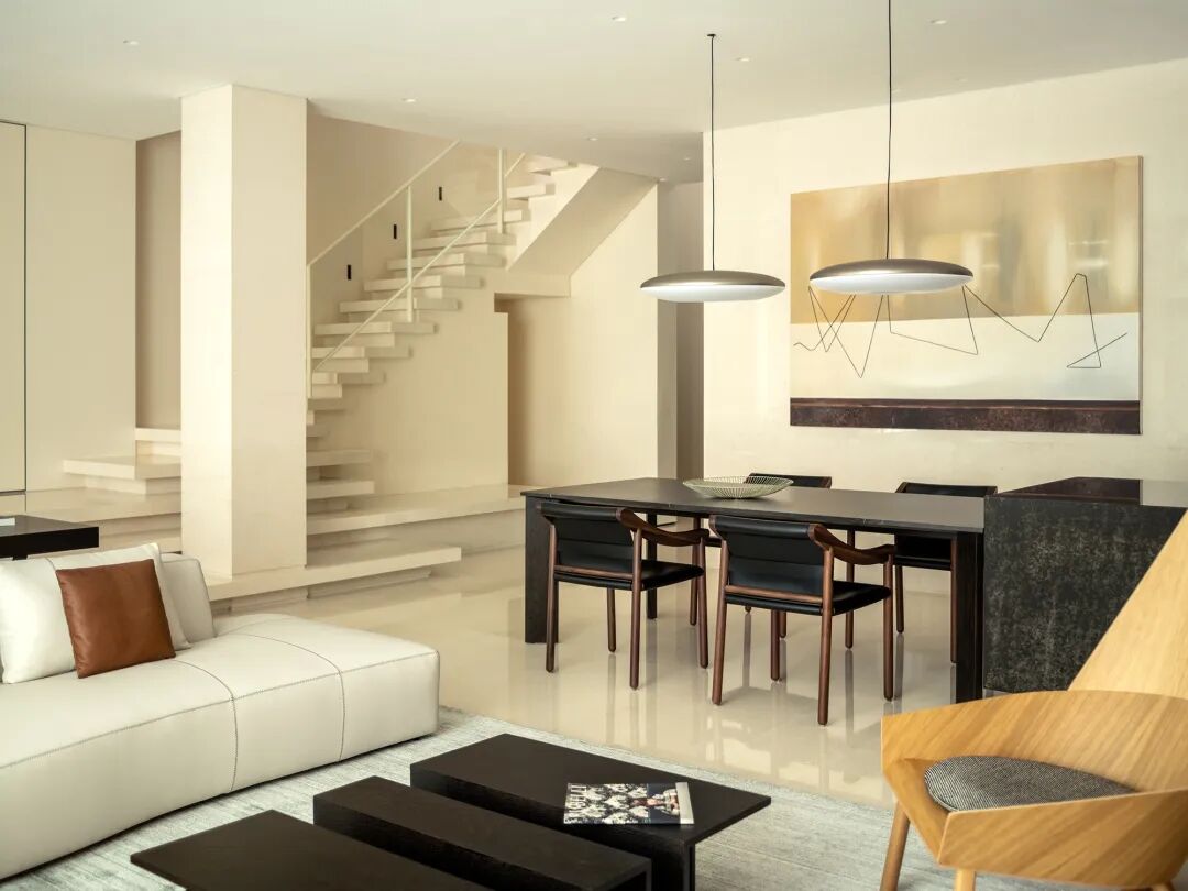 楼梯间从一层到三层纵向打通,套景手法也同步贯彻。两个独立的空间彼此延伸,规整和谐。三层则略显外凸,交错的体块与严谨的配比,进一步彰显着细腻的处理。