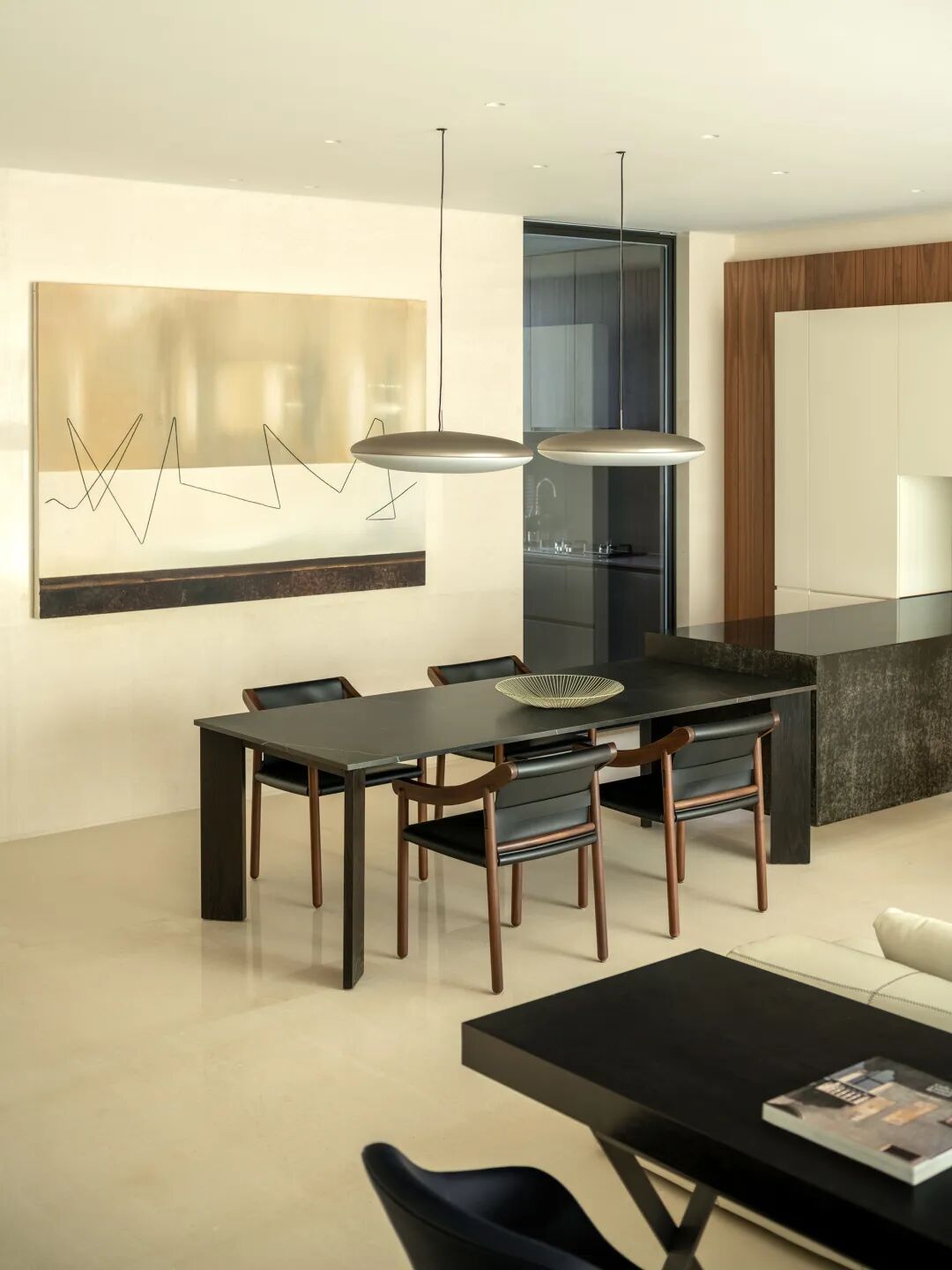 晨昏朝暮,一日三餐,温情相伴。用餐区笔触利落清朗,高低连贯起伏,恰到好处的比例拿捏框定秩序,哑光与亮面、粗粝与光滑相映生辉,于率性中也勾勒着仪式感。