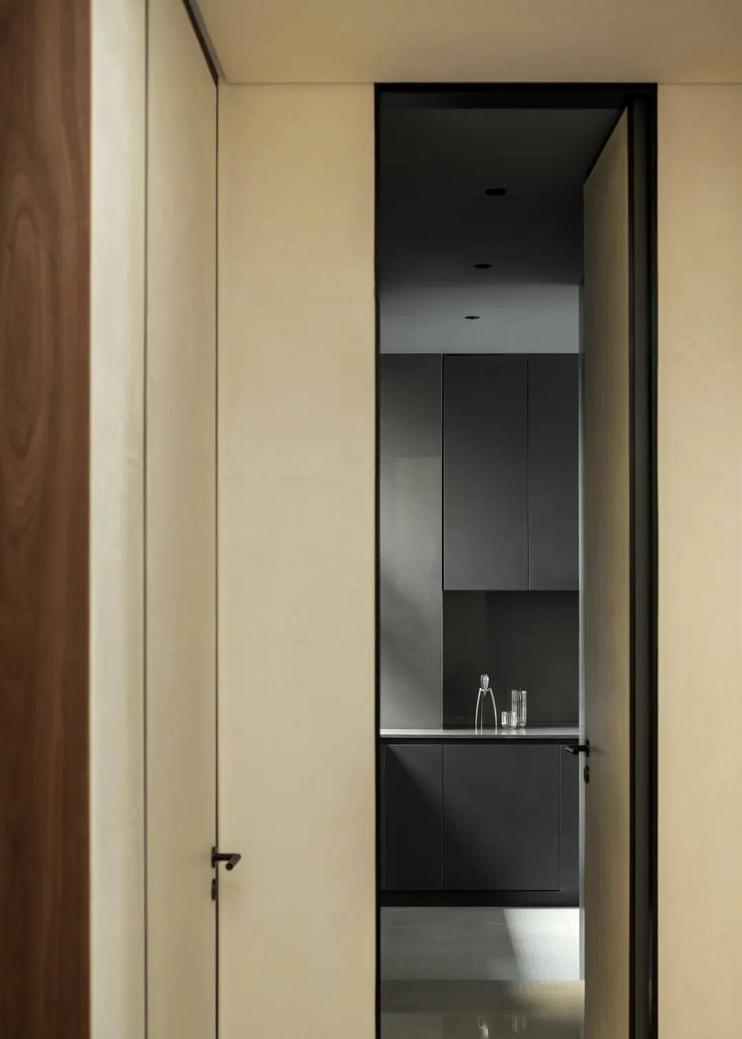 体贴周全的设计也离不开对厨房内外部的关系梳理。有效扩大原始厨房尺度,并增设双通道步入模式,打开与公共区域的联动。于内合理排布,提升实用效率,在暗黑静谧的调性里,无声流淌卓越质感。