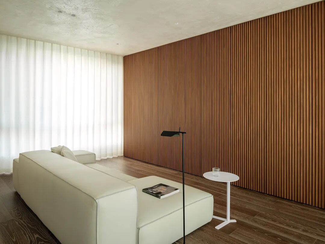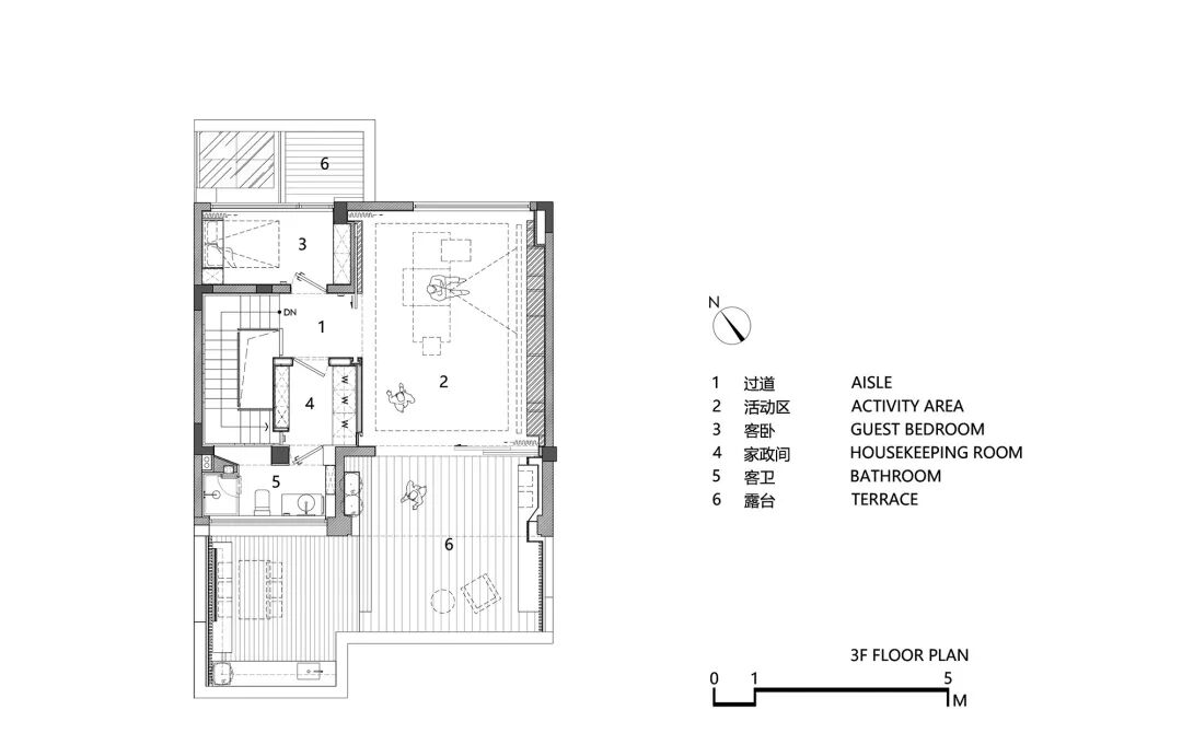 家庭全员的情感凝聚也需精心安放,三楼活动区以大道至简的廓形,悦纳多元之需,强调其变化与成长性,也为未来预留更多可能。一进到底的格栅节奏井然,延伸引导视角并兼具储物功能,与室外露台联动,模糊界限,将生活的界面扩充得广袤无垠。