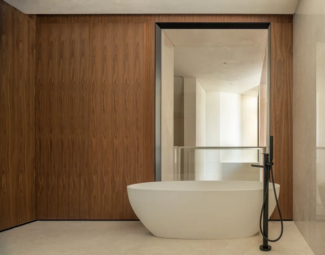 卫浴空间以台盆镜柜充当枢纽向外围发散,调动多维感观,给予便捷呵护。在光线引入和氛围营造上也细致规划,浴缸临窗而设,内外交融对话,让沐浴变得更加惬意与趣味。