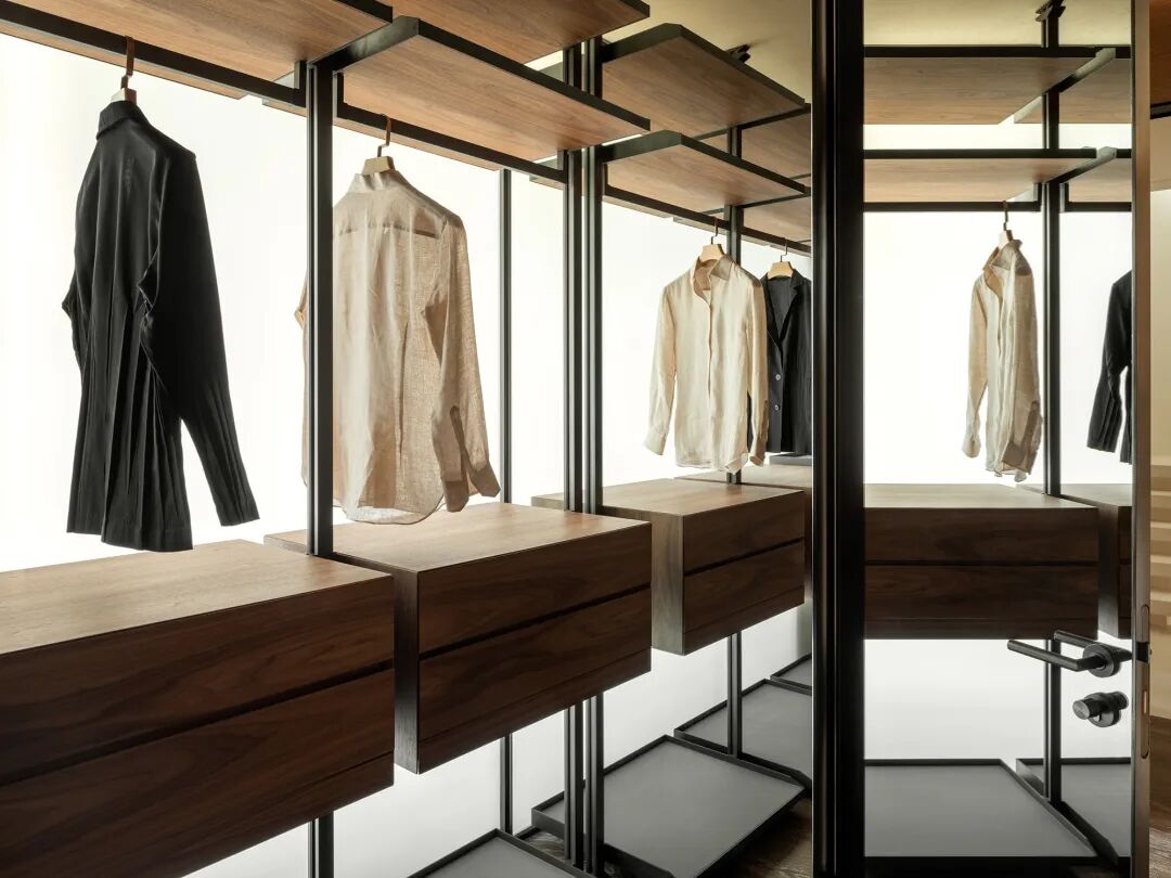 步入式衣帽间开放的格局、完善的分区、利落的构造一目了然。引入镜象手法,令这一场域扩容,一镜之隔使其相映成趣,也折射出无限遐想。