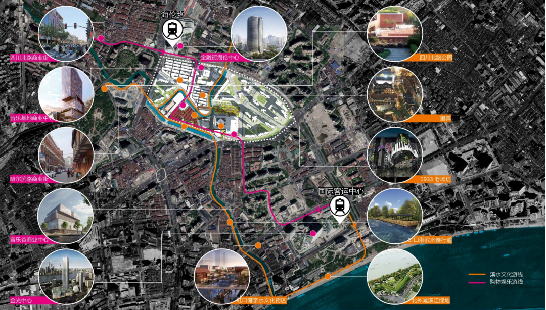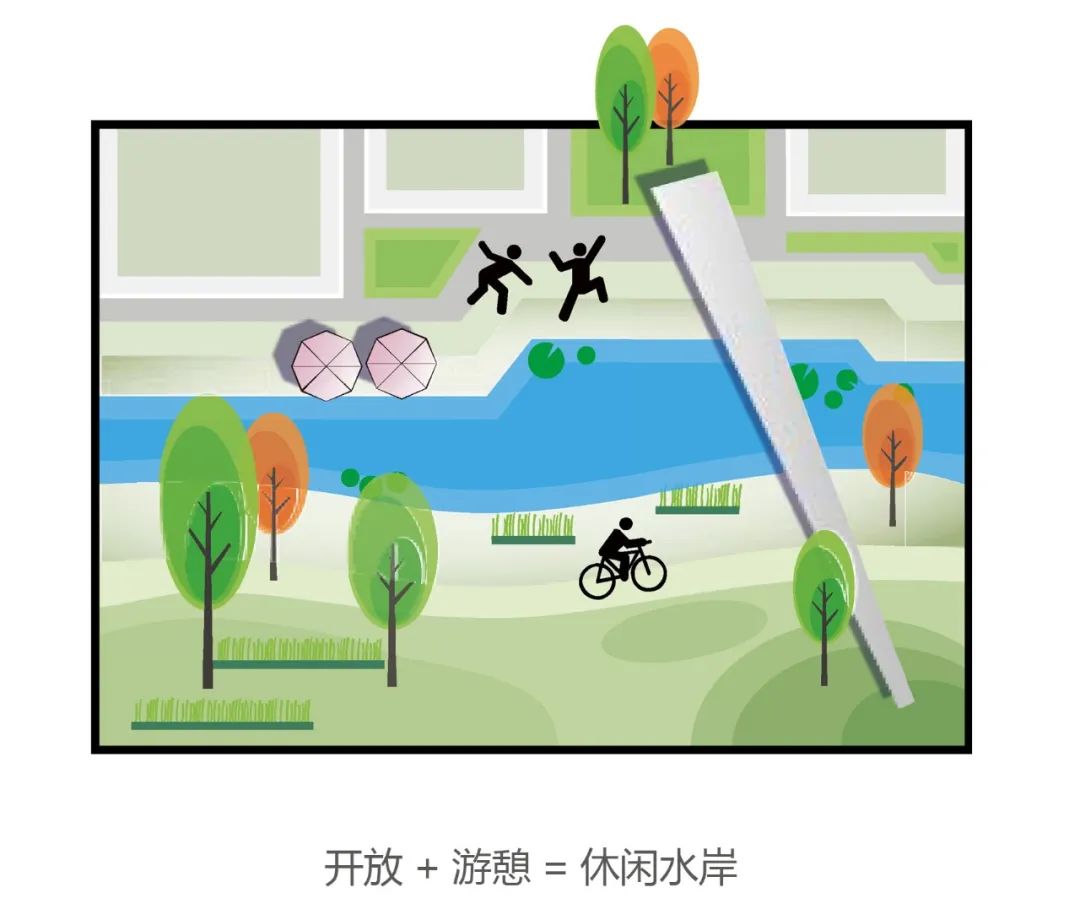 在周家嘴路至四平路以及辽宁路部分河岸段,增设特色的观景平台,打造适宜交流及活动的活力休闲水岸。
