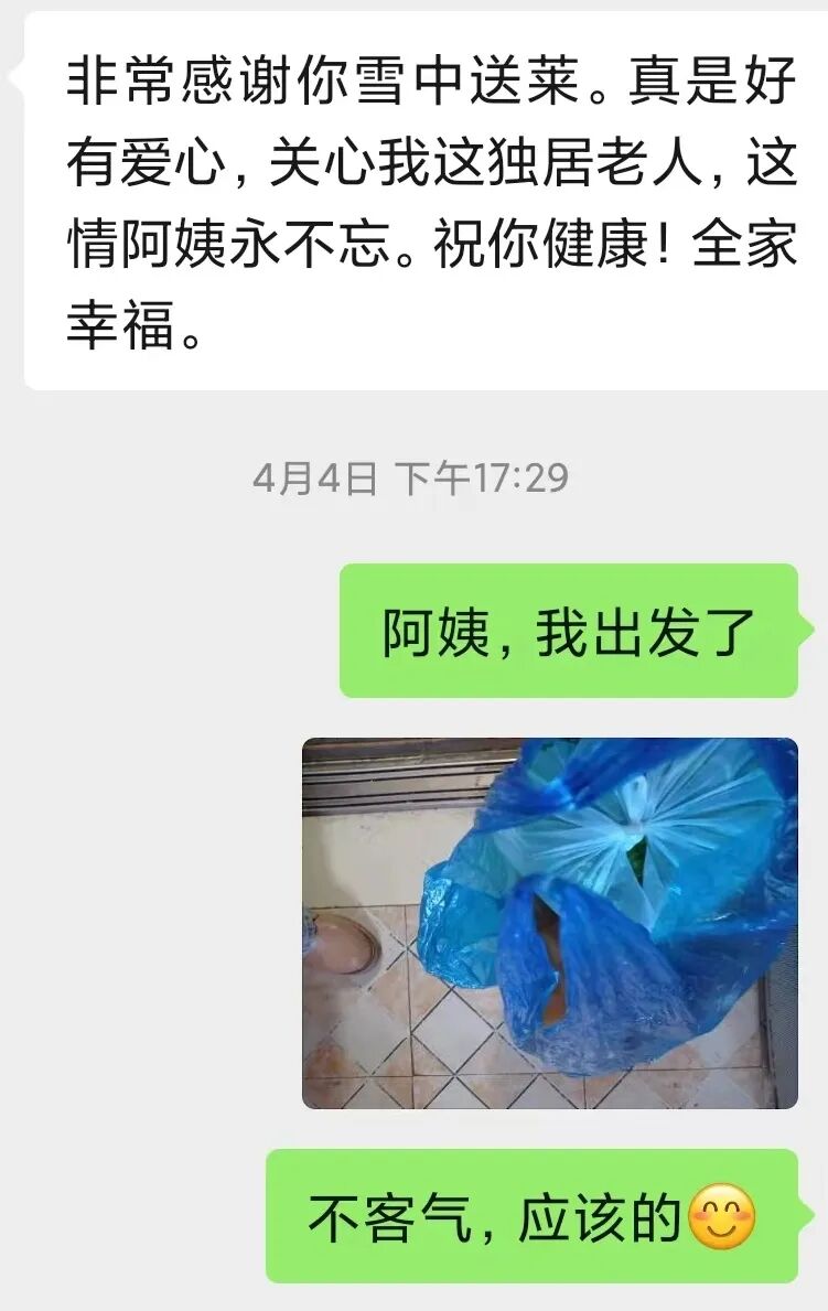 给独居的老人捎上一份刚团的蔬菜;