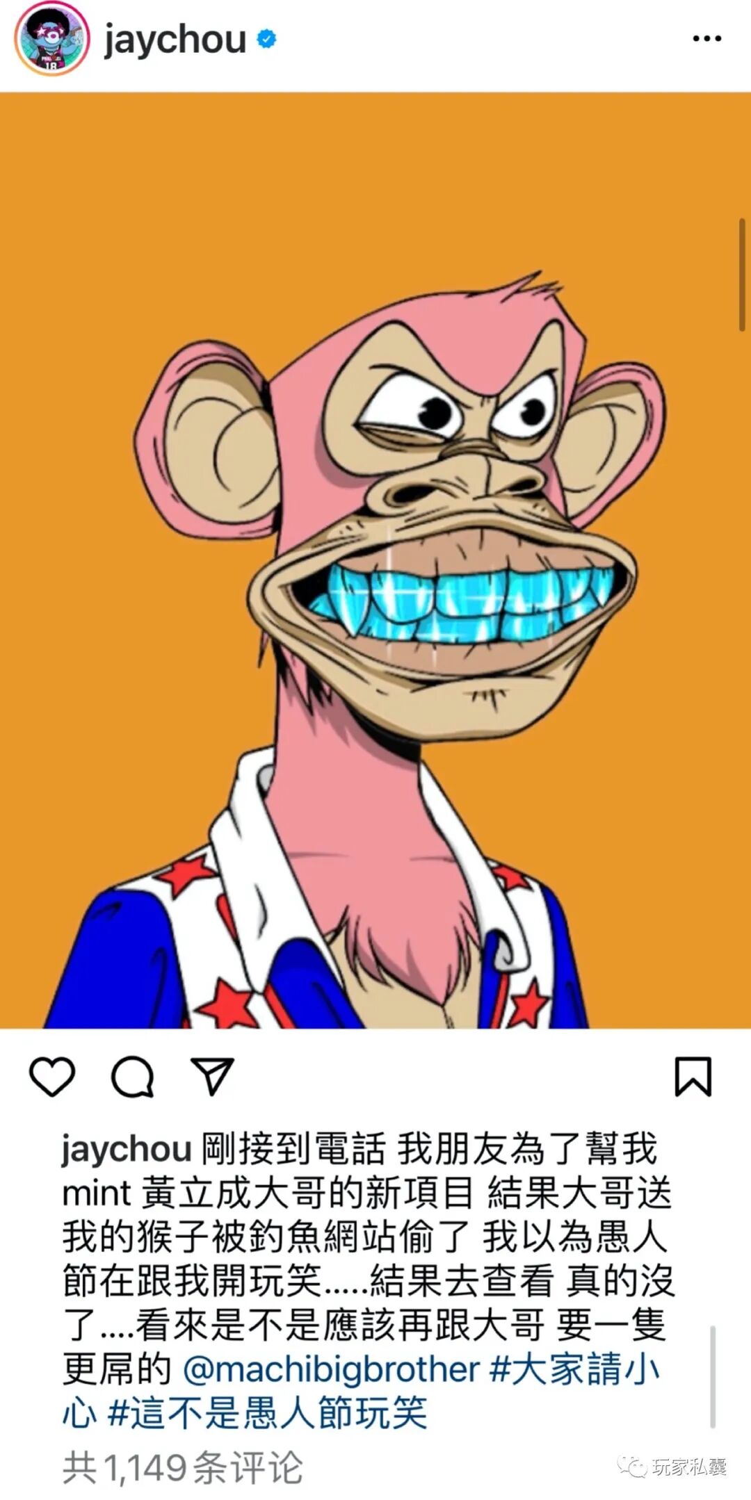 别再惦记周杰伦那个42万美金的NFT,愚人节那天就被偷了!他当天在INS上告诉大家,自己在OpenSea(NFT交易平台)账号被偷。被电话通知的那一刻,他都还以为是愚人节的玩笑,结果亲自打开网页,就赫然看到红色警告。
