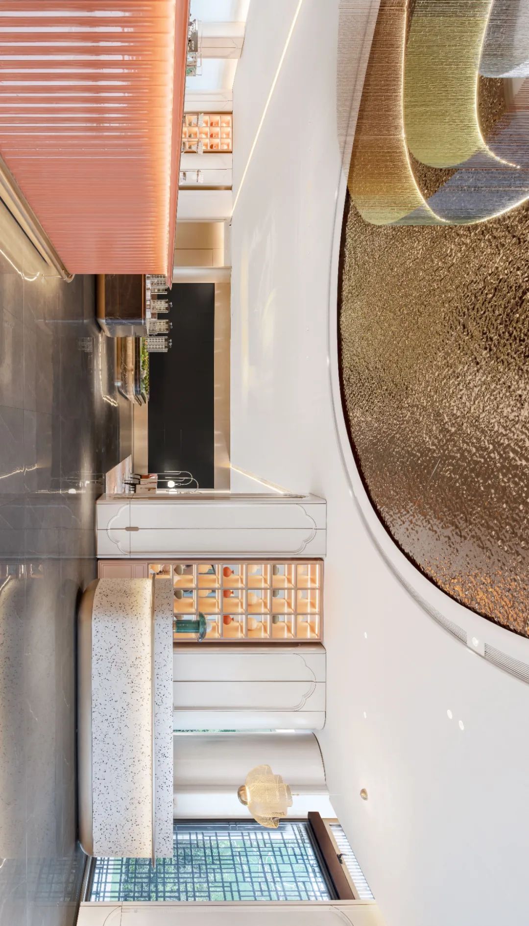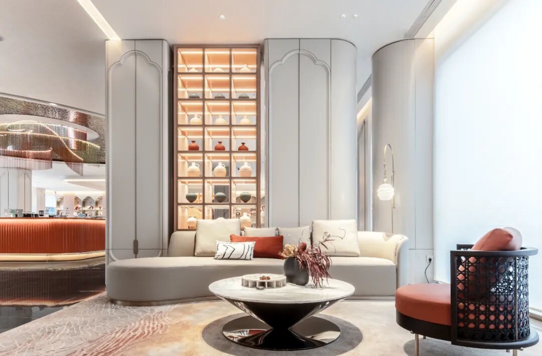 设计采用了简洁现代的设计语言,来解构传统文化中的经典传承。云纹流动之美,在设计上的进一步演绎中,充分应用到了空间细部的立体雕琢,空间立面的融合, 文创衍生和空间的结合。
